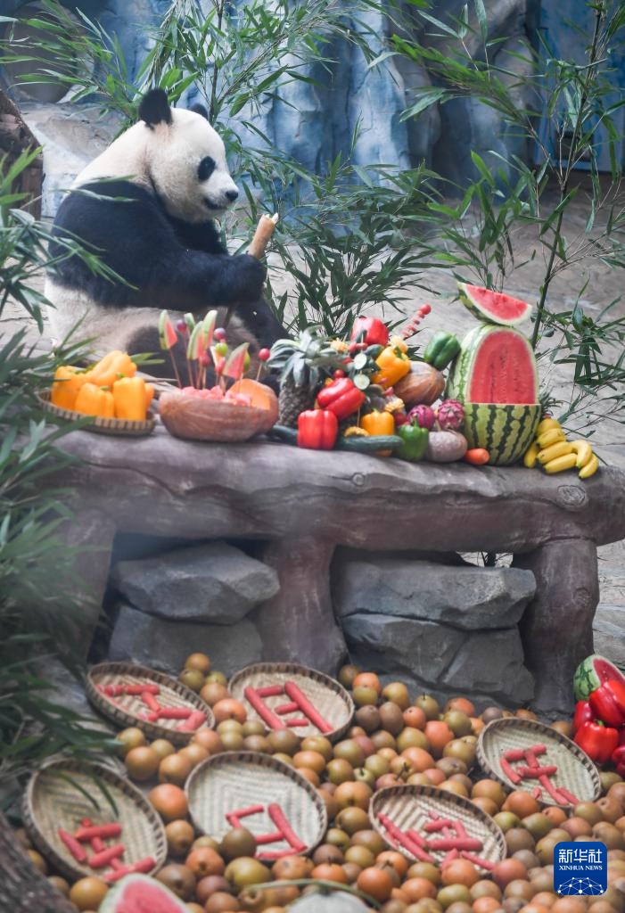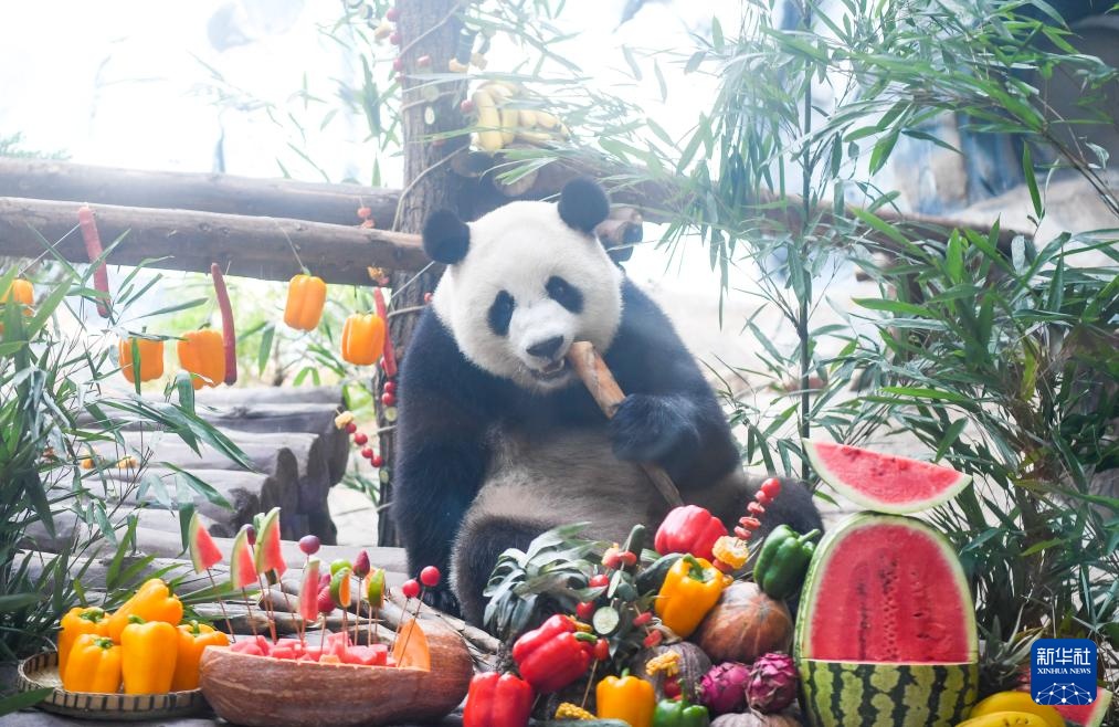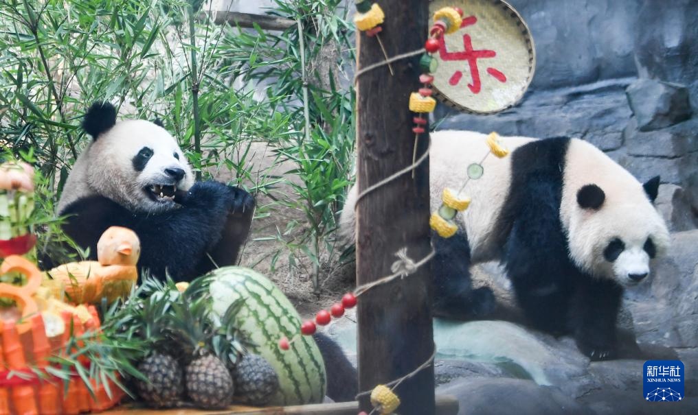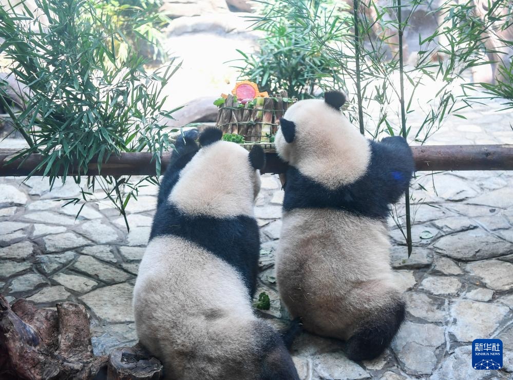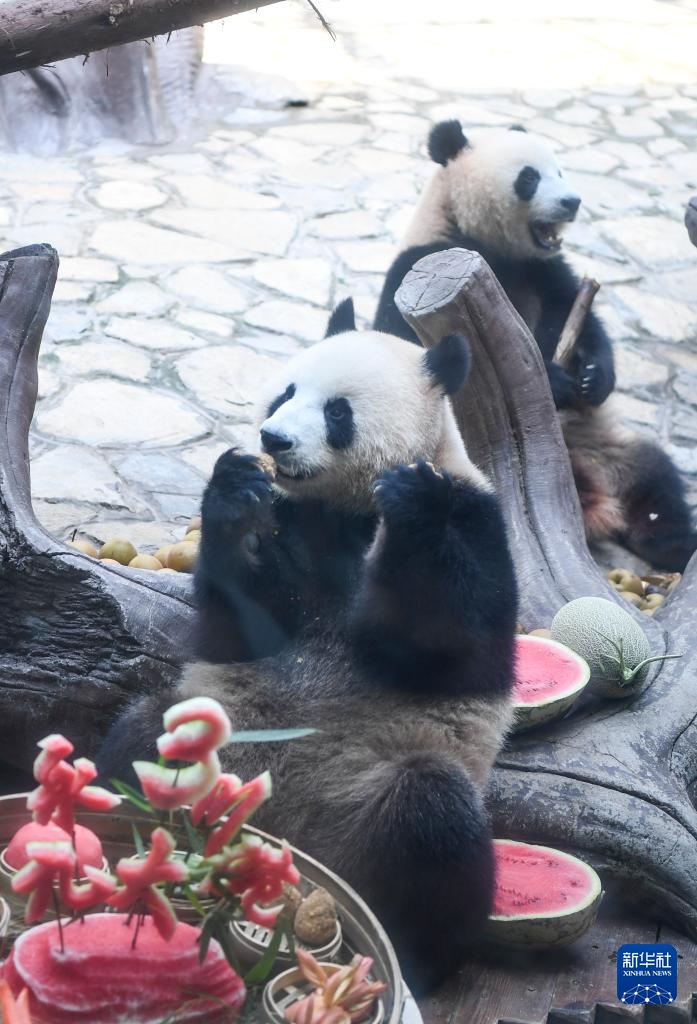 当日,重庆永川乐和乐都动物主题乐园为3岁的双胞胎大熊猫青花、青露和6岁的大熊猫巧月举办趣味十足的集体生日会。