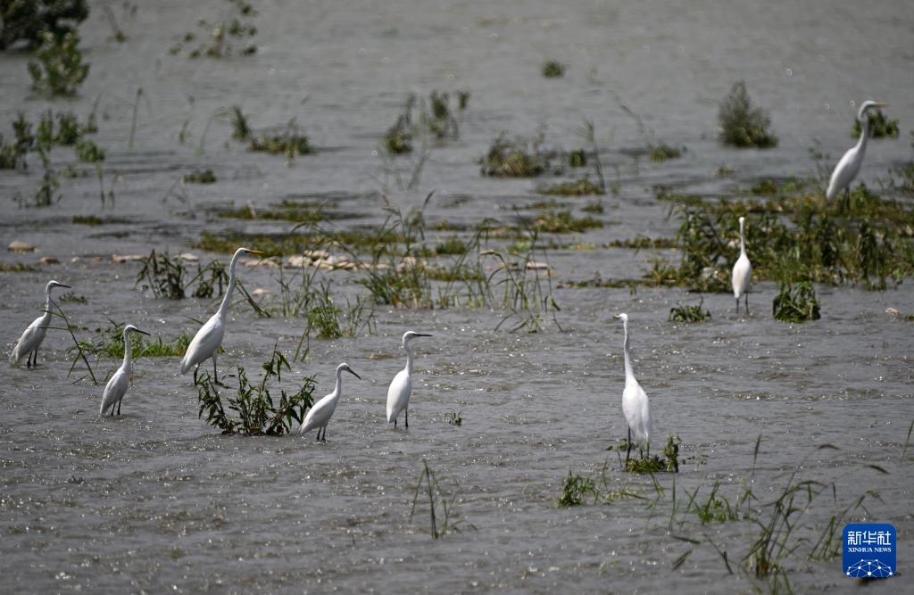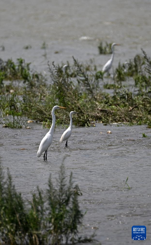 白鹭在天津市蓟州区罗庄子镇的泃河河滩休憩觅食(8月6日摄)。