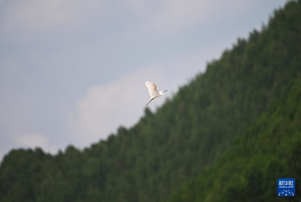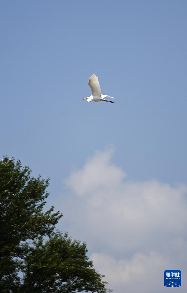 在天津市蓟州区罗庄子镇,白鹭在空中飞翔(8月6日摄)。