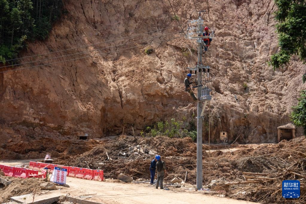 8月7日,在资兴市州门司镇燕窝村,电力工人在抢修电力设施。