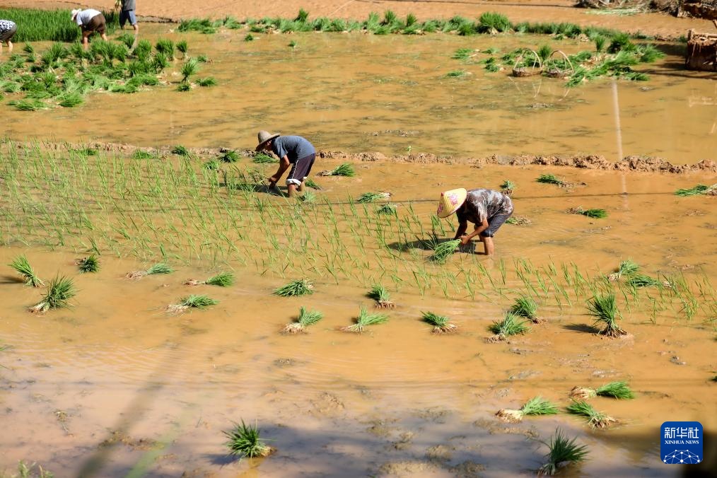 8月7日,在资兴市兴宁镇,村民在抢插晚稻。