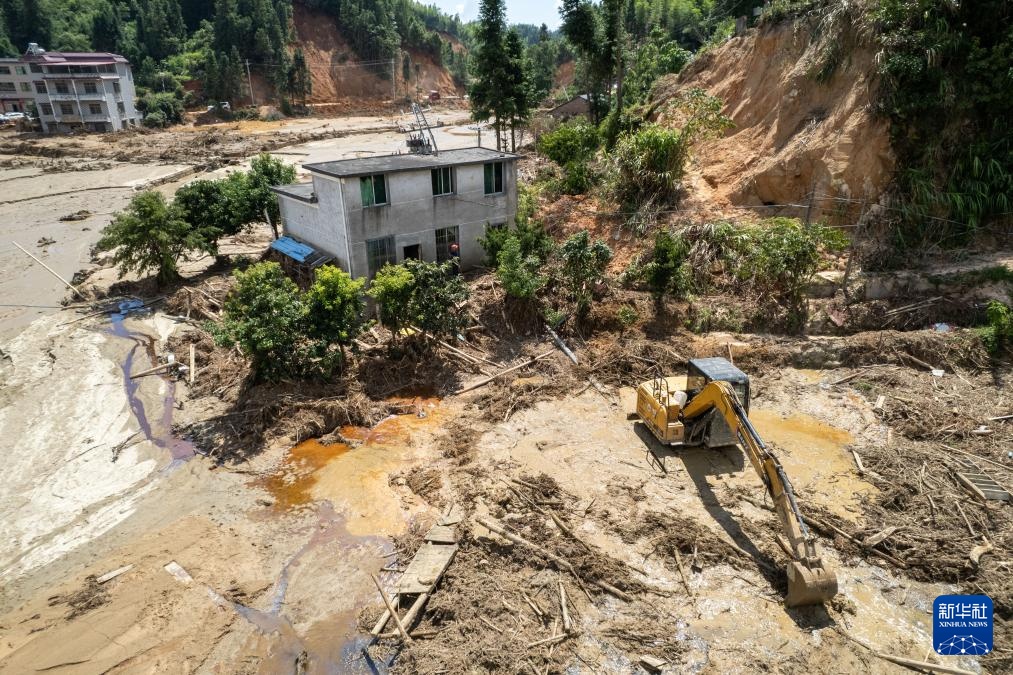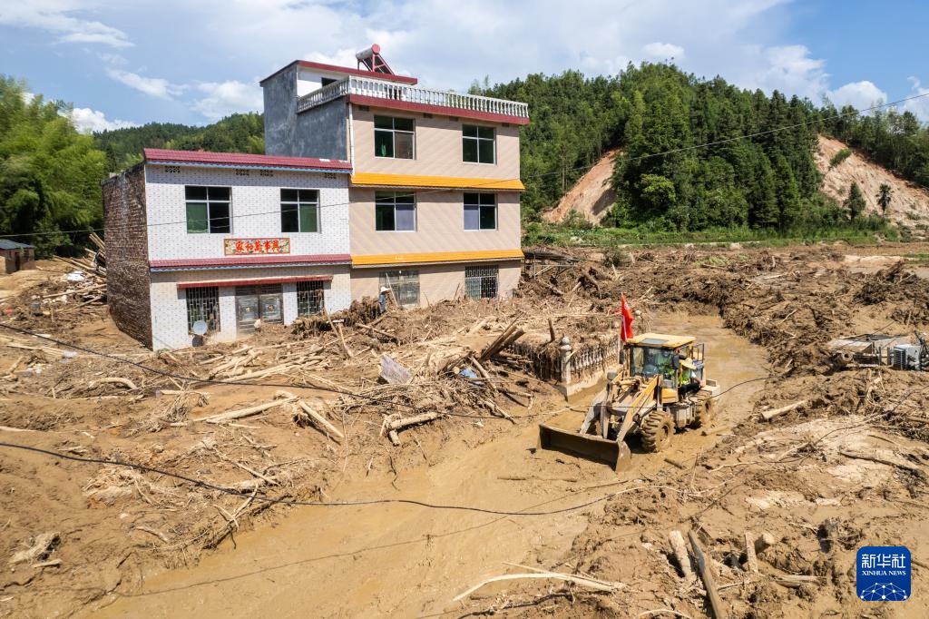 8月7日,在资兴市州门司镇燕窝村,抢险队伍在清理民房前的淤泥(无人机照片)。