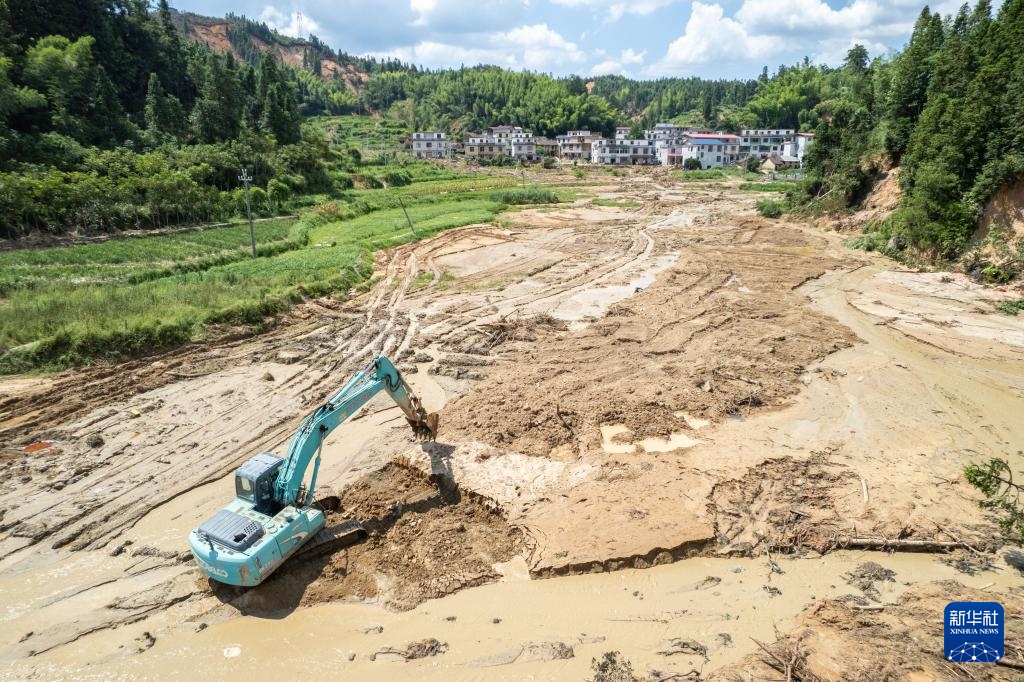 8月7日,在资兴市州门司镇燕窝村,挖掘机在疏通河道(无人机照片)。