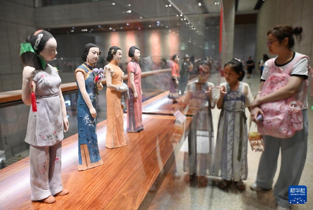 8月7日,中国工艺美术馆展厅举行的中华历代服饰泥塑展吸引游客驻足观看。