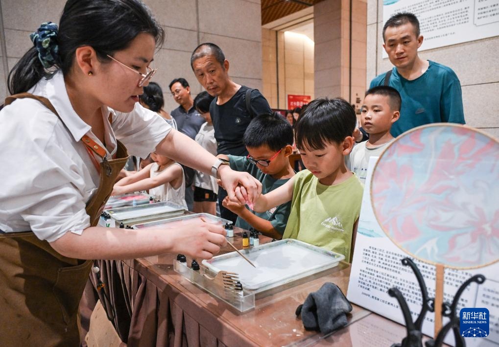 8月7日,在非遗体验区,小朋友在工作人员指导下体验纸笺加工技艺。