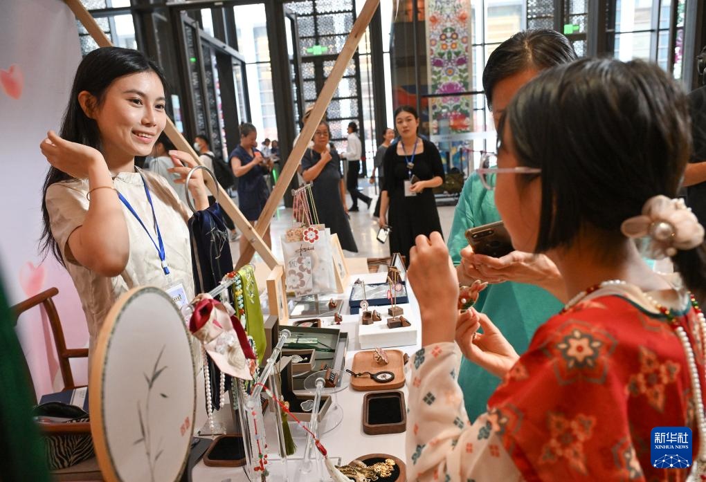 8月7日,在非遗市集上,一名摊主(左)向游客介绍饰品。