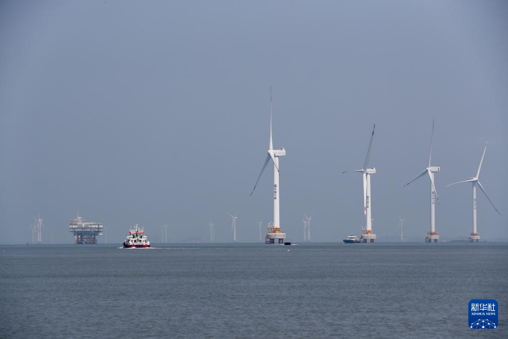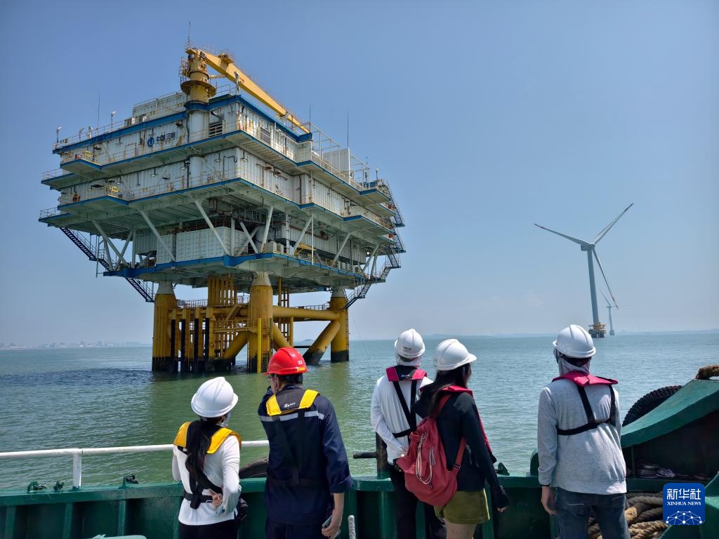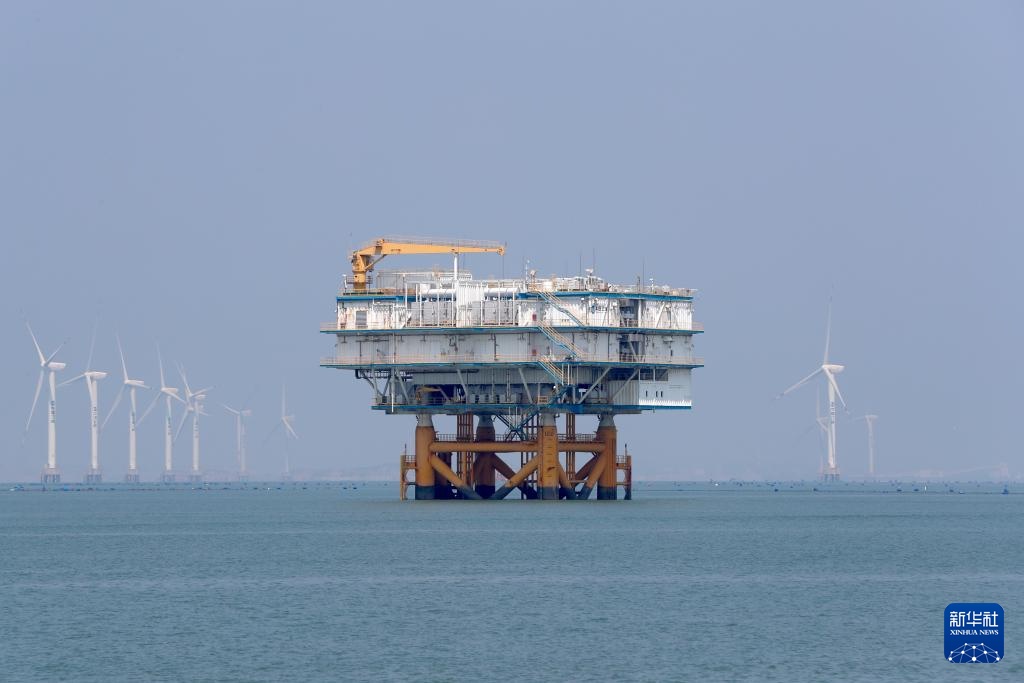 这是8月8日拍摄的三峡福清兴化湾海上风电场海上升压站。福建三峡海上风电国际产业园自主生产的部分海上风电机组在这个风电场装机投产。