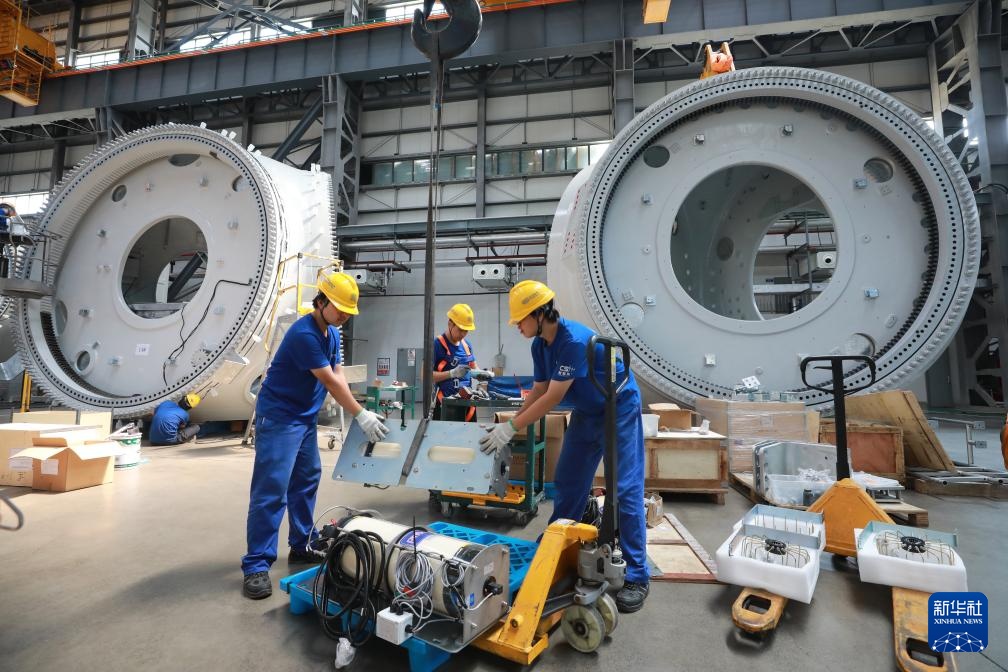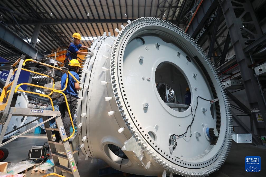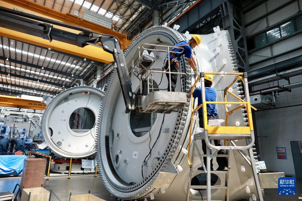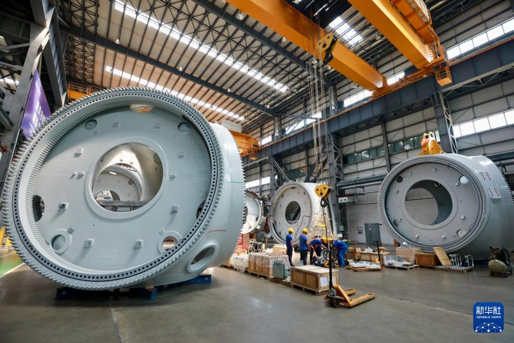 8月8日,在福建三峡海上风电国际产业园东方电气风电(福建)有限公司的生产现场,工人在生产18兆瓦半直驱海上风电机组。