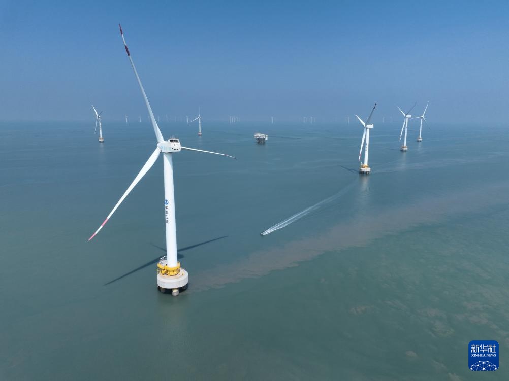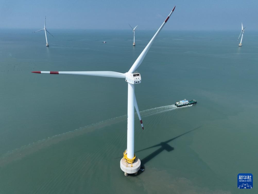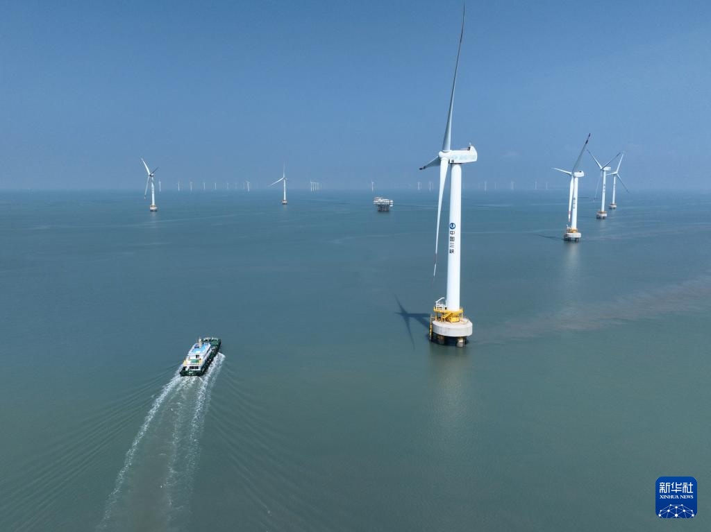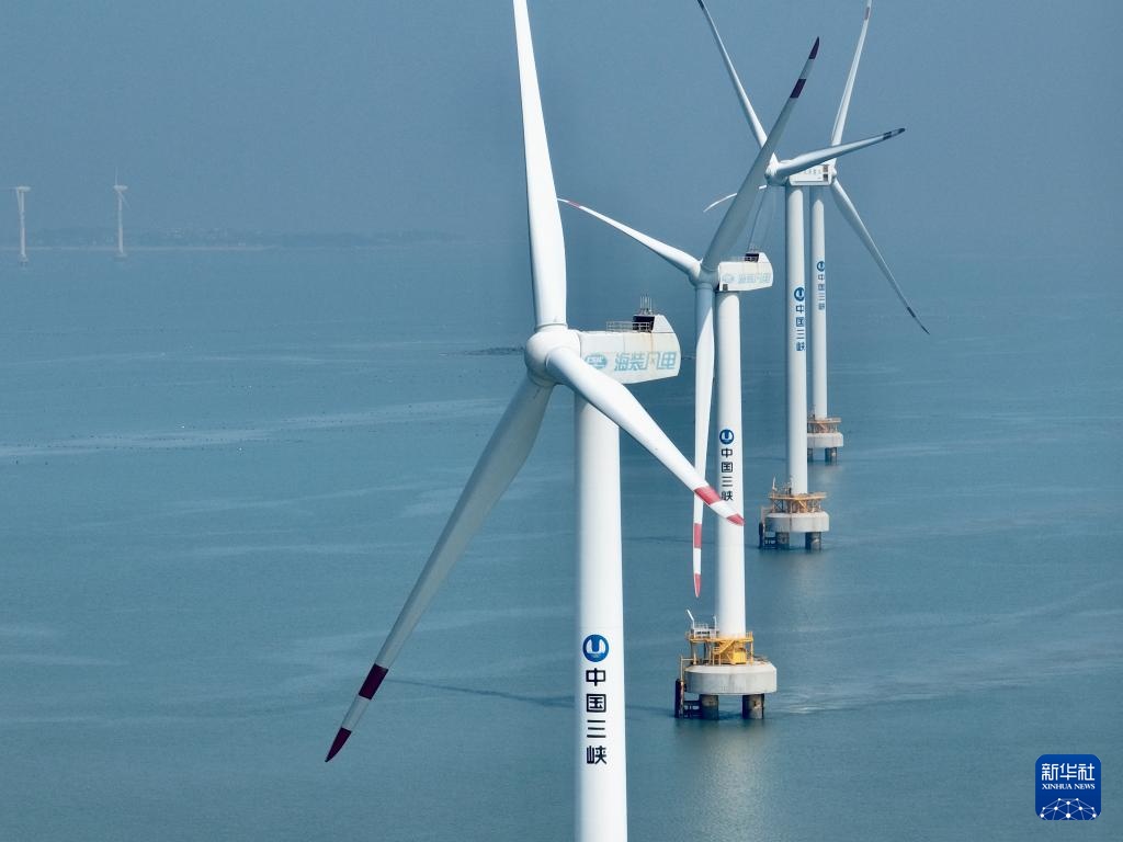 这是8月8日拍摄的三峡福清兴化湾海上风电场(无人机照片)。福建三峡海上风电国际产业园自主生产的部分海上风电机组在这里装机投产。