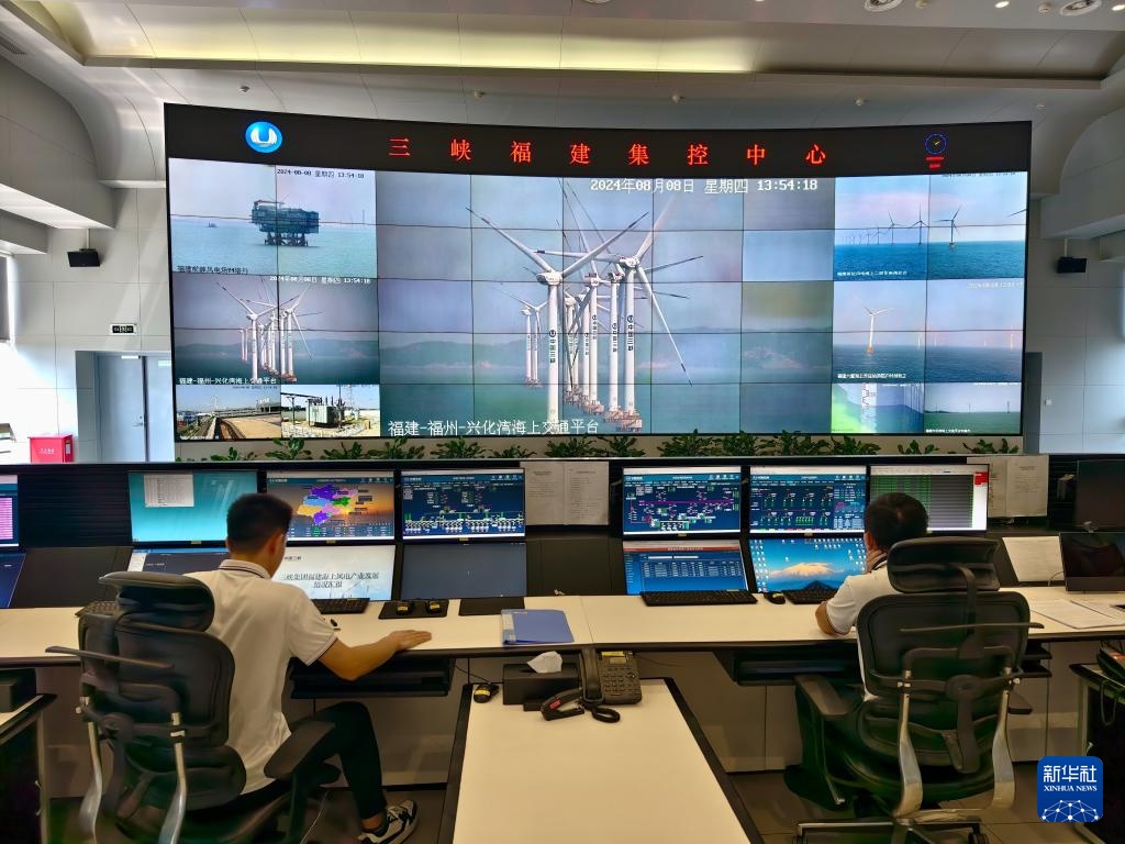 8月8日,工作人员在福建三峡海上风电国际产业园三峡福建集控中心内值守。