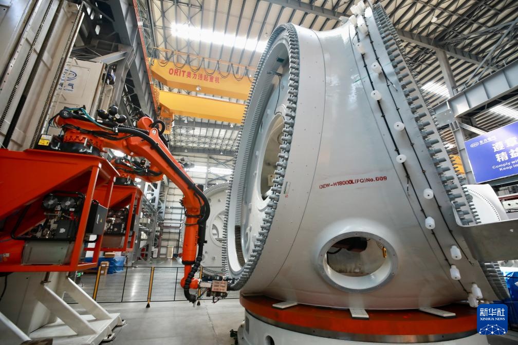 8月8日,在福建三峡海上风电国际产业园东方电气风电(福建)有限公司的生产现场,机械臂在生产18兆瓦半直驱海上风电机组。