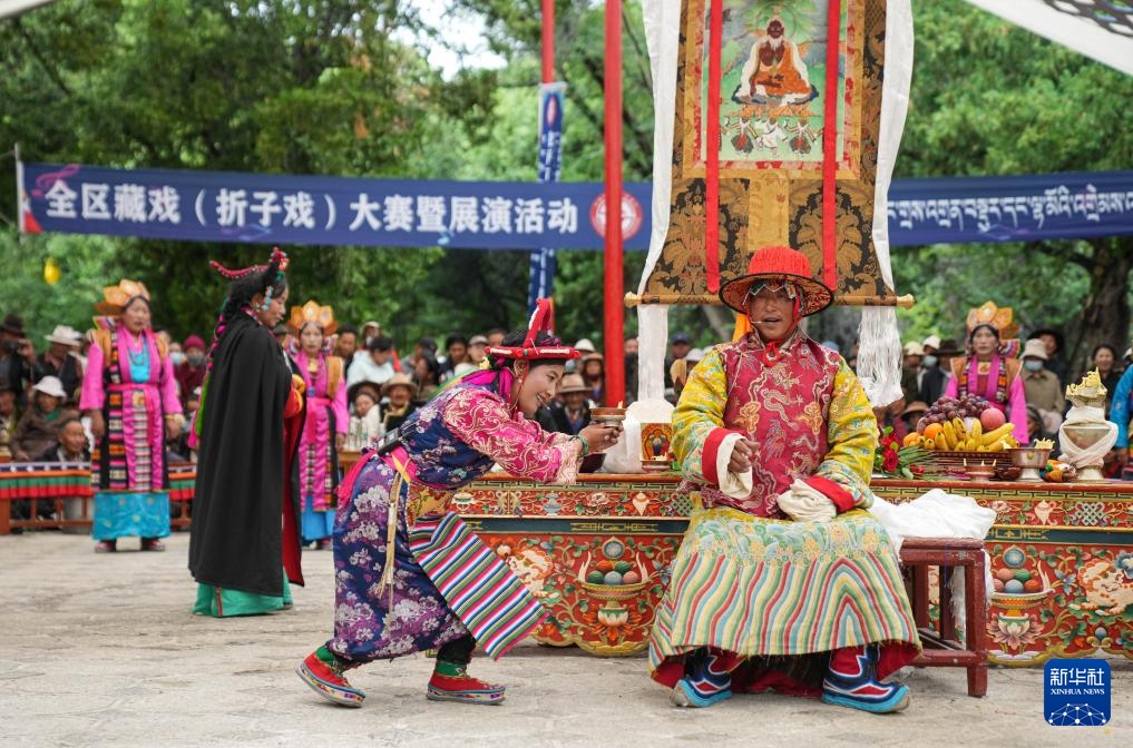 8月8日,山南市洛扎县曲措藏戏队在拉萨罗布林卡表演传统藏戏《卓瓦桑姆》。