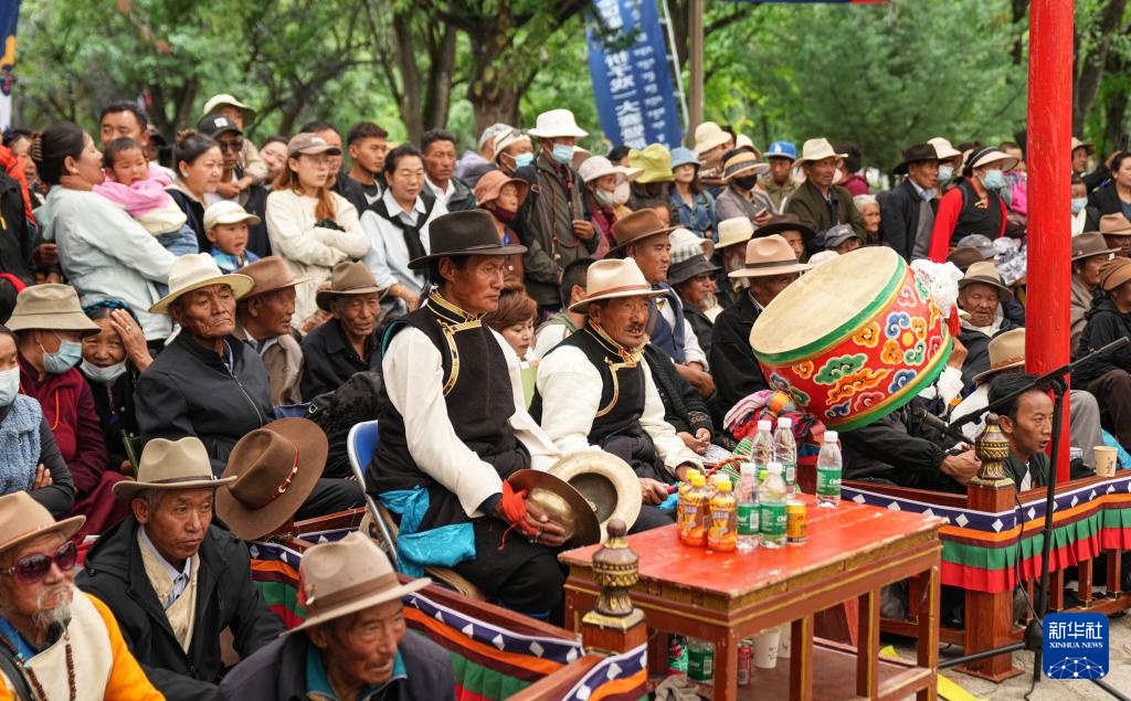 8月8日,山南市洛扎县曲措藏戏队锣鼓队在拉萨罗布林卡为藏戏表演伴奏。