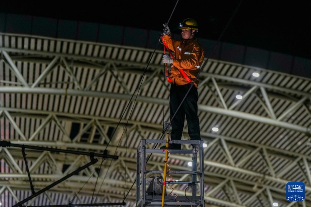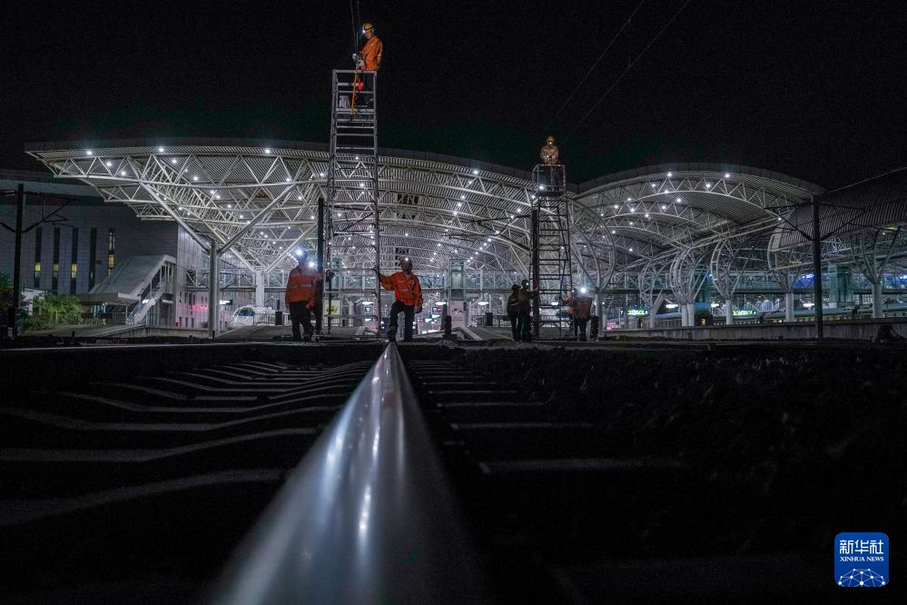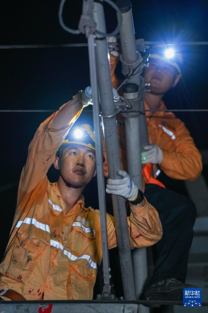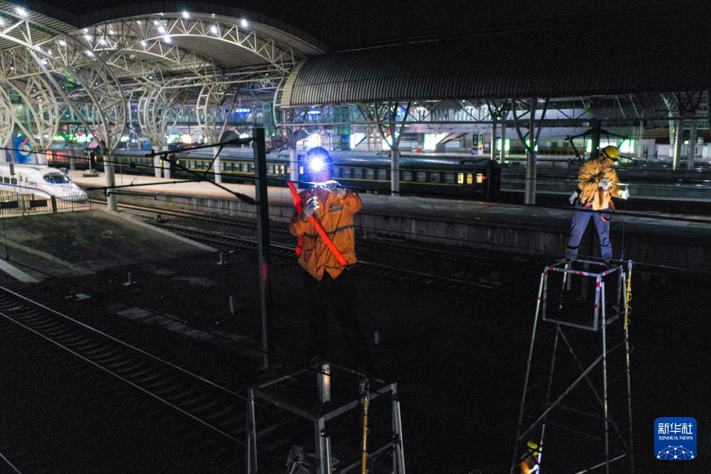 连日来,江苏多地发布高温预警。上海高铁基础设施段集中投入500余人次,在凌晨铁路“天窗期”对沪宁城际、宁杭高铁的接触网设备进行检修,保障旅客安全舒适出行。