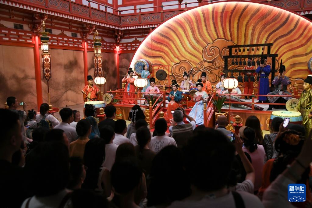 8月6日,游客在西安长安十二时辰主题街区内观看演出。
