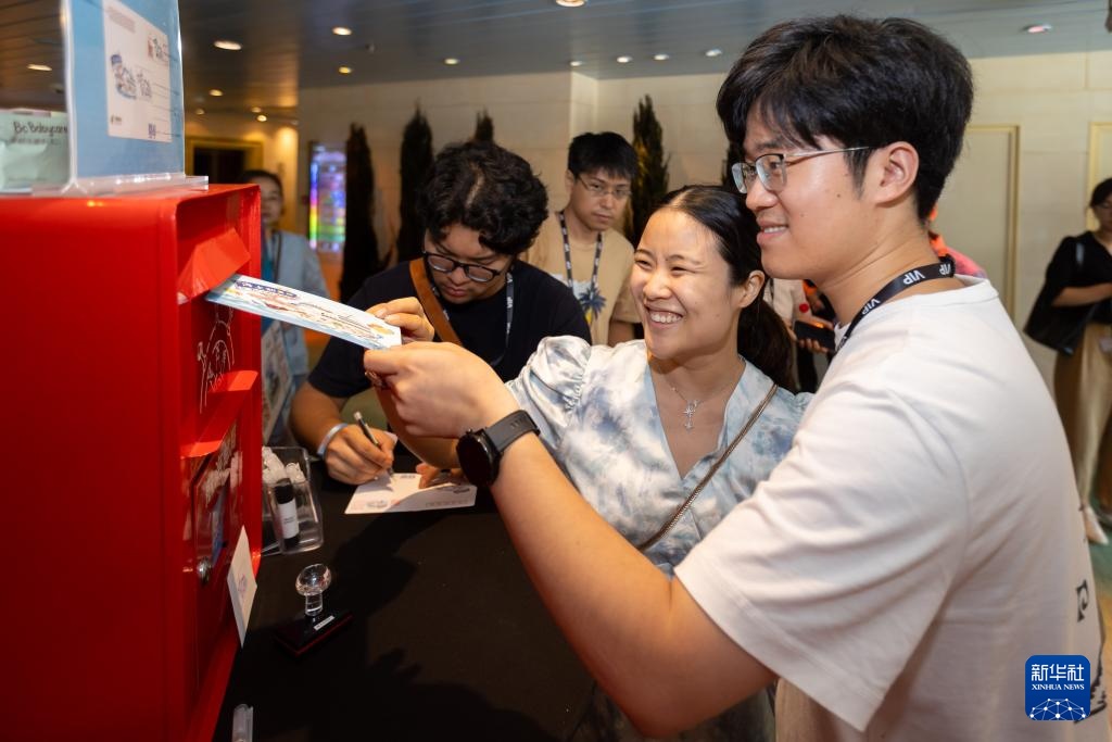 8月9日,一对新人在“蓝梦之歌”邮轮上共同投入明信片。
