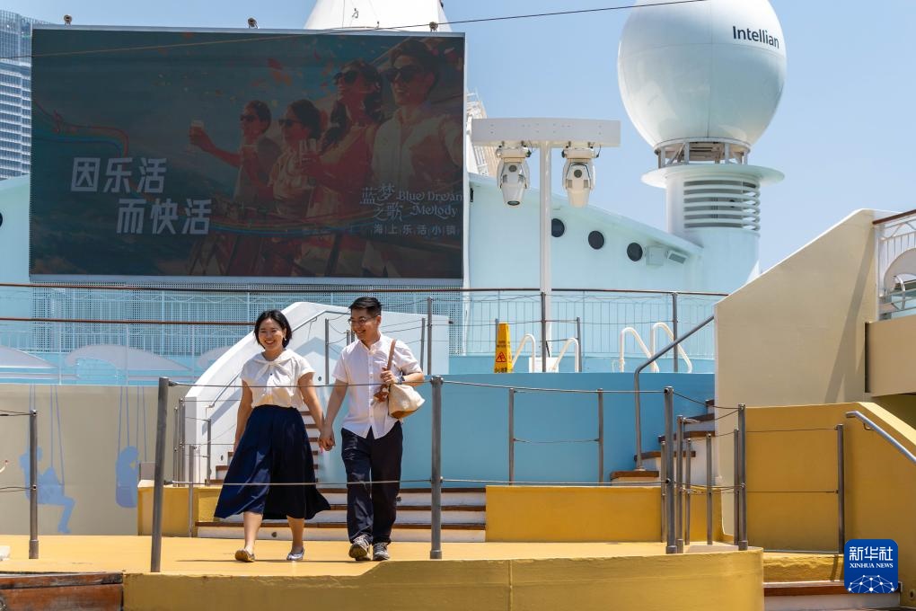 8月9日,一对新人在“蓝梦之歌”邮轮上参观。