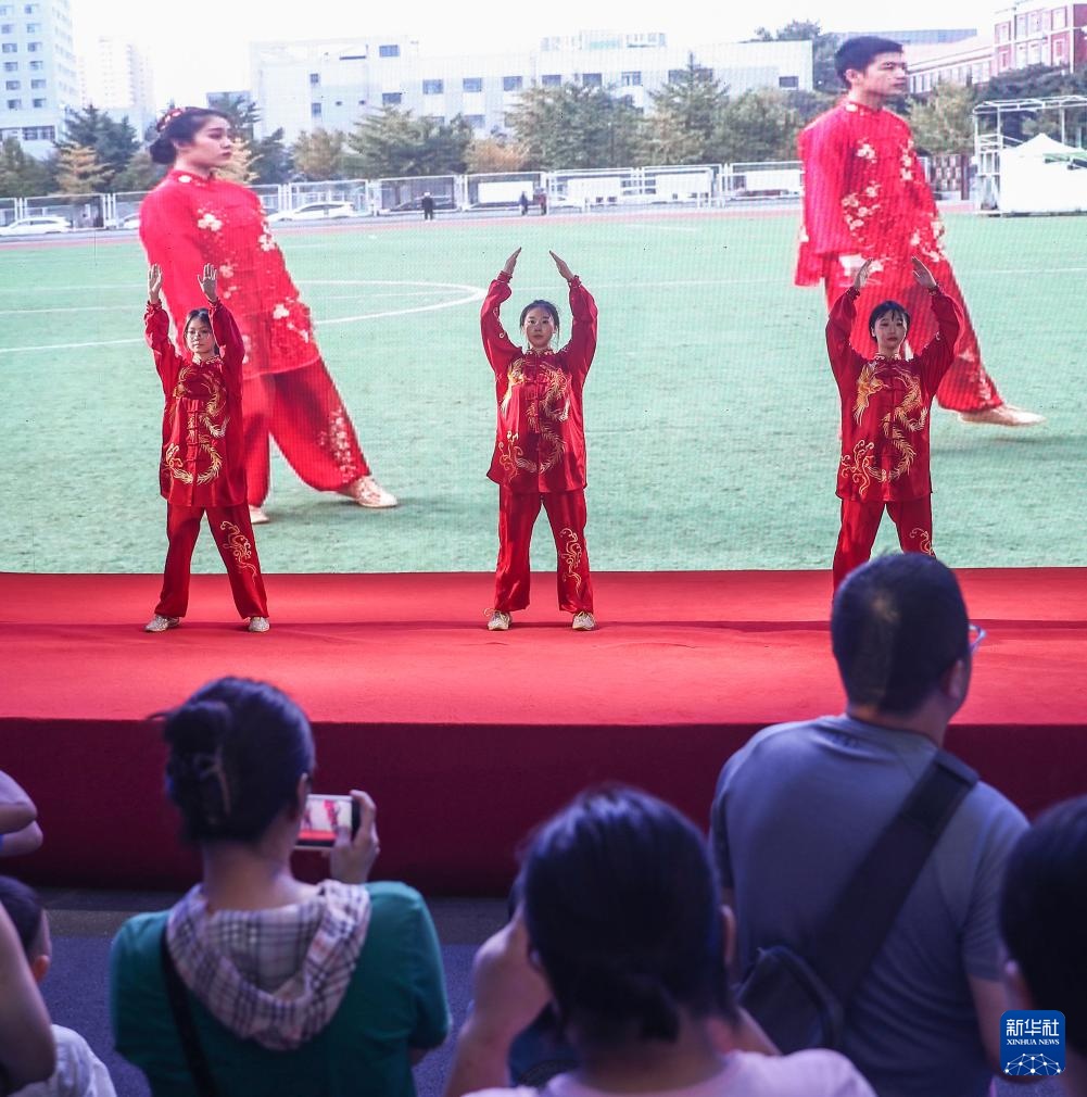 8月9日,市民在中医药文化夜市上观看八段锦表演。