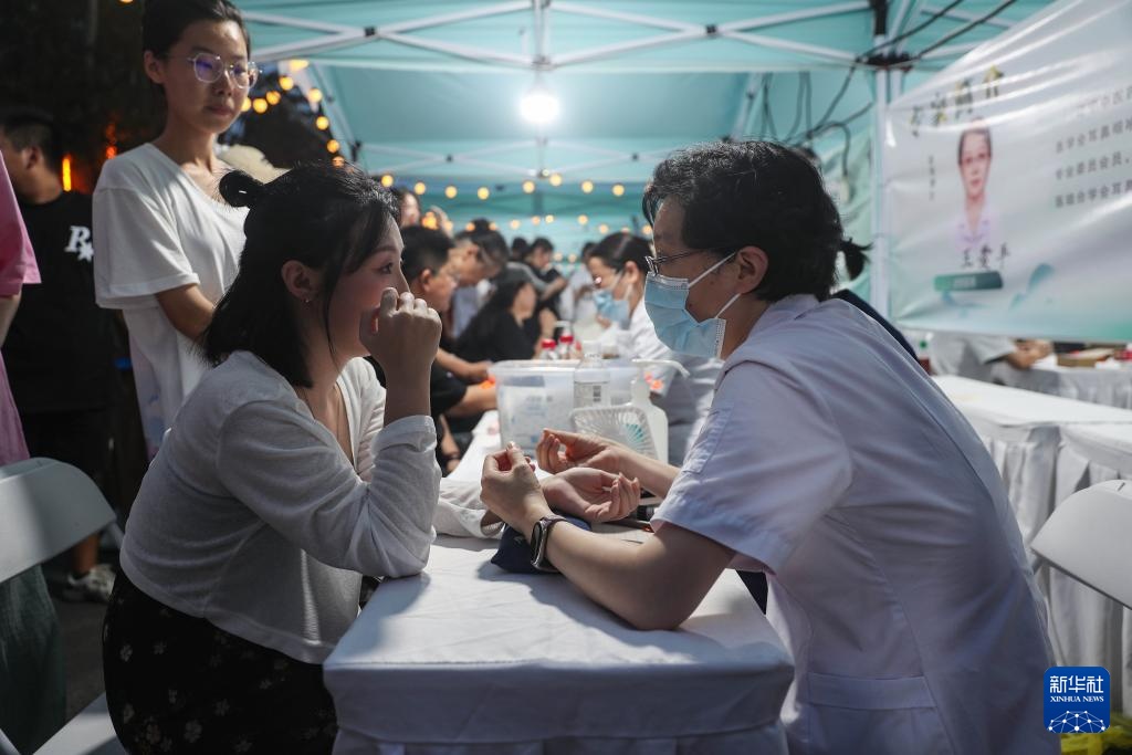 8月9日,在中医药文化夜市的义诊区域,医生为患者号脉。