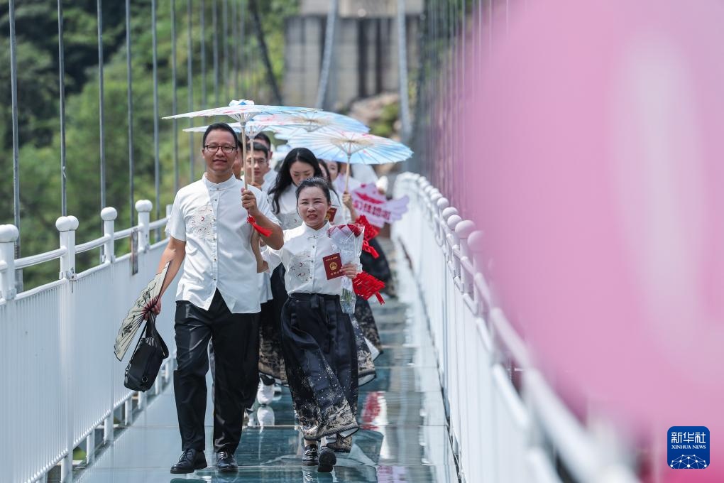 8月10日,新人们在临安太湖源景区的玻璃桥参加主题活动(无人机照片)。