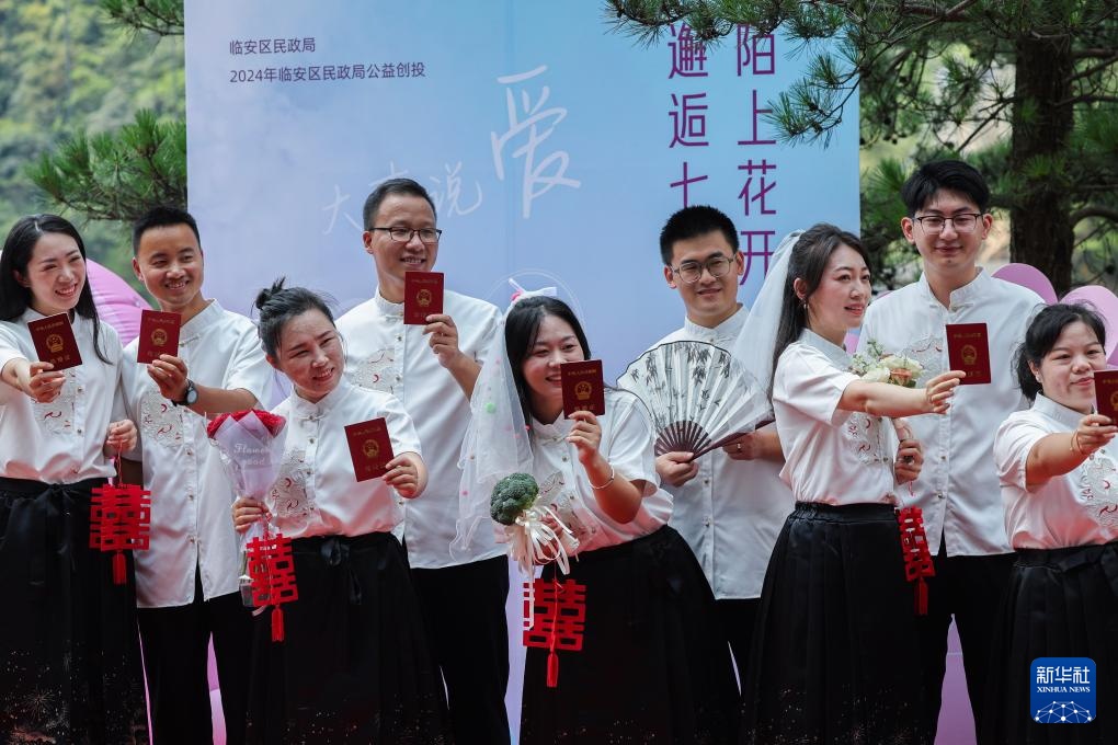 8月10日,新人在杭州市临安区民政局婚姻登记中心拍照留念。
