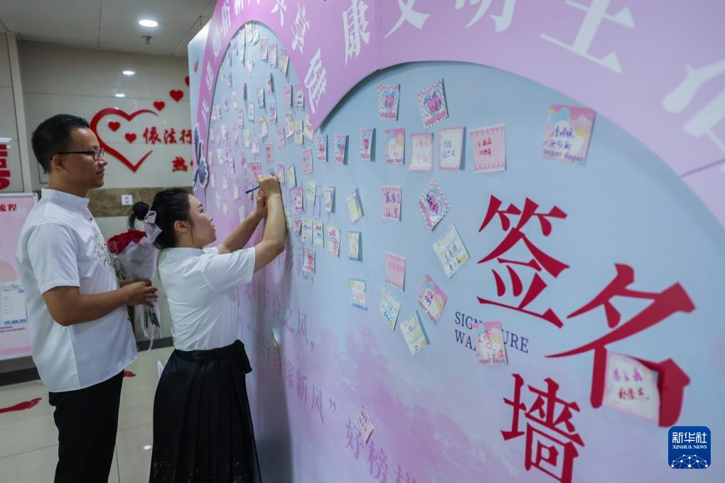 8月10日,新人在杭州市临安区民政局婚姻登记中心签名墙上签名。