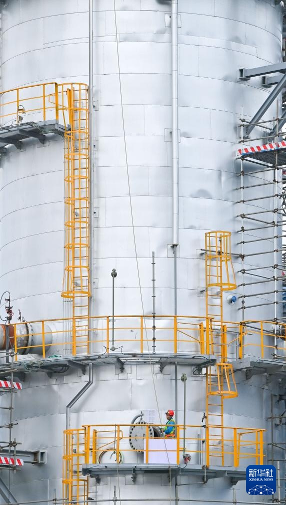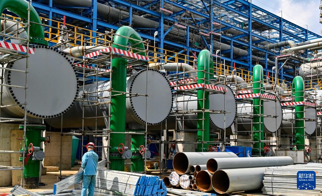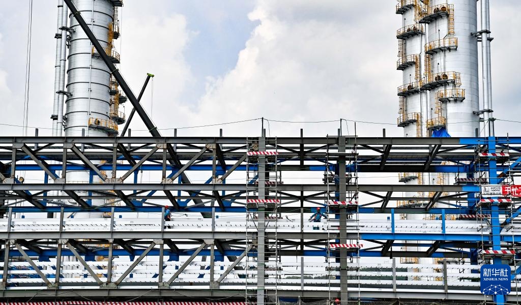 8月8日,工人在吉林省吉林市的吉林石化炼油化工转型升级项目120万吨/年乙烯装置现场施工建设。