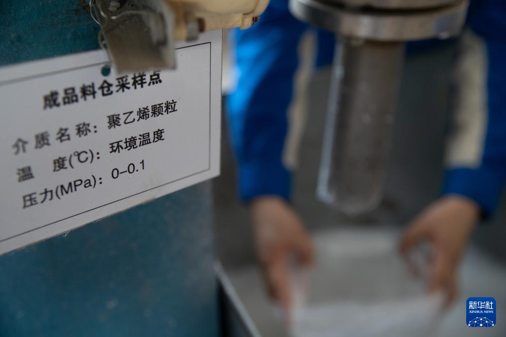 8月8日,在中国石油大庆石化公司一生产车间内,技术人员在对聚乙烯产品进行采样。