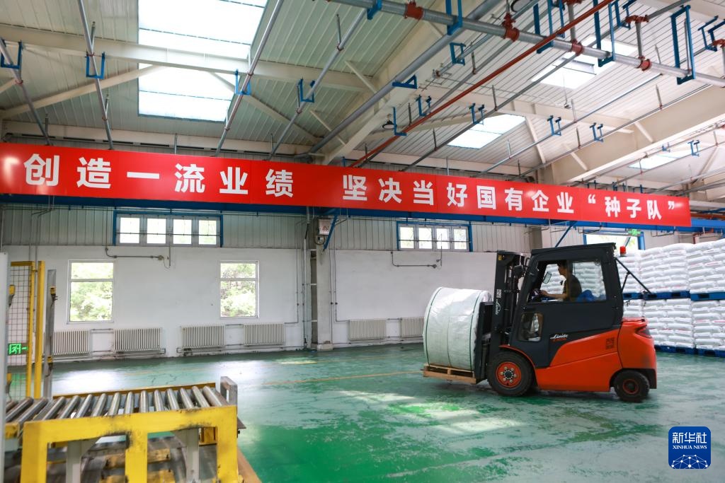 8月7日,在辽阳石化公司车间,工人操作叉车装卸高性能聚丙烯产品。
