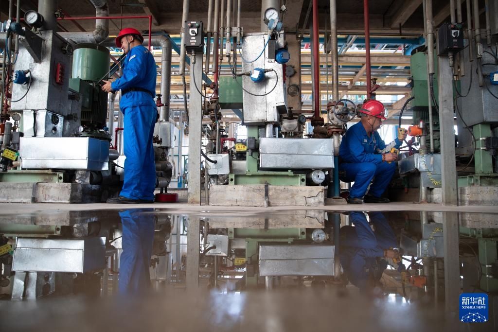 8月8日,在中国石油大庆石化公司一生产车间内,技术人员在巡检。