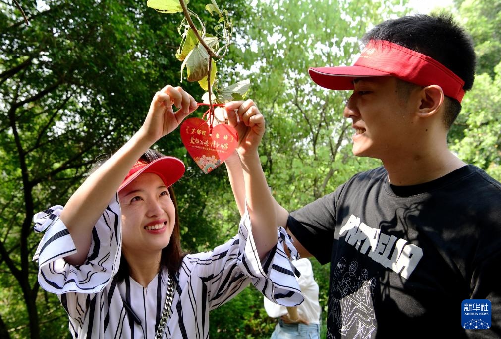 8月10日,定居在厦门的台青苏郁程(右)与来自福建三明的爱人朱婷在“同心树”上绑上“同心结”。