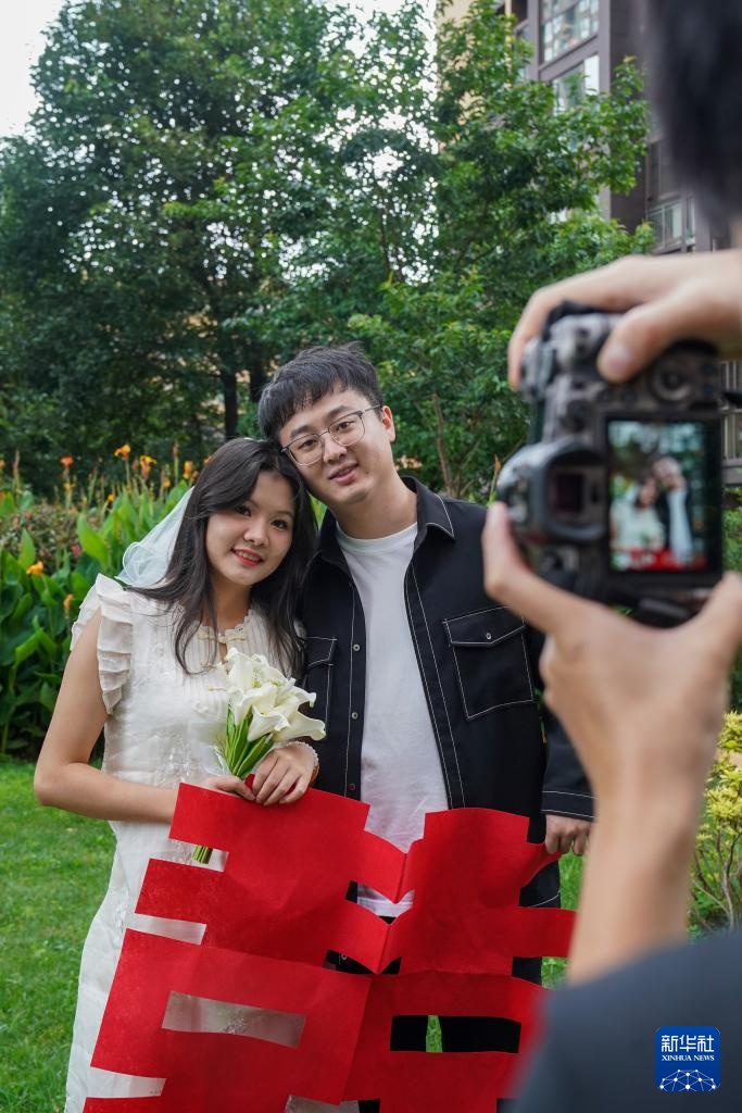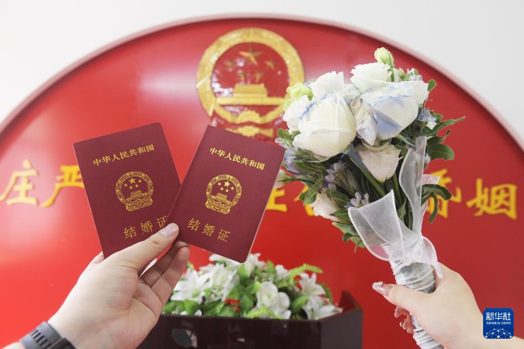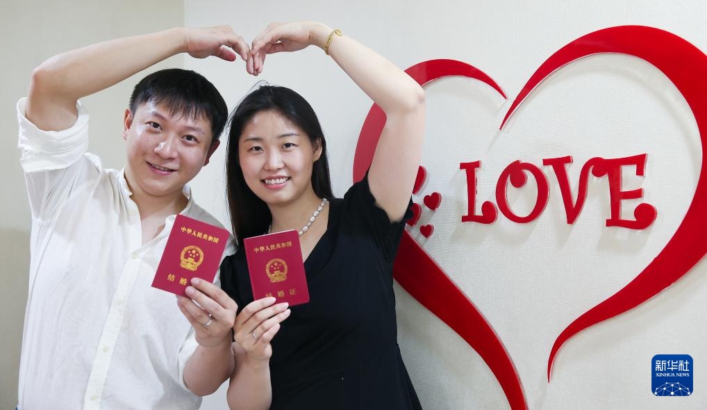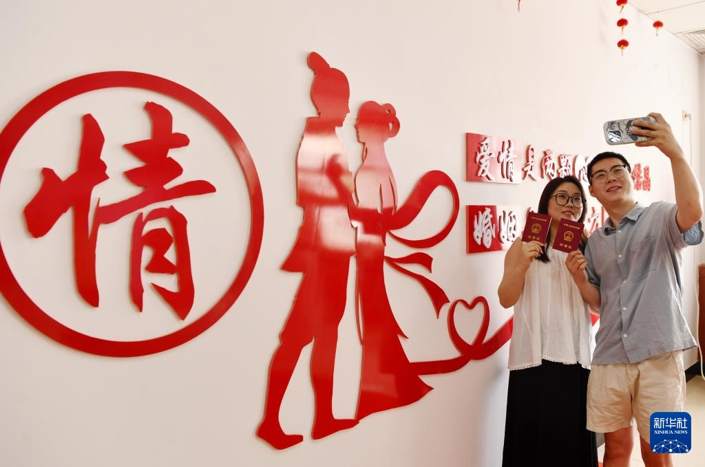 8月10日,在云南省昆明市五华区政务服务中心,一对新人领取结婚证后拍照留念。