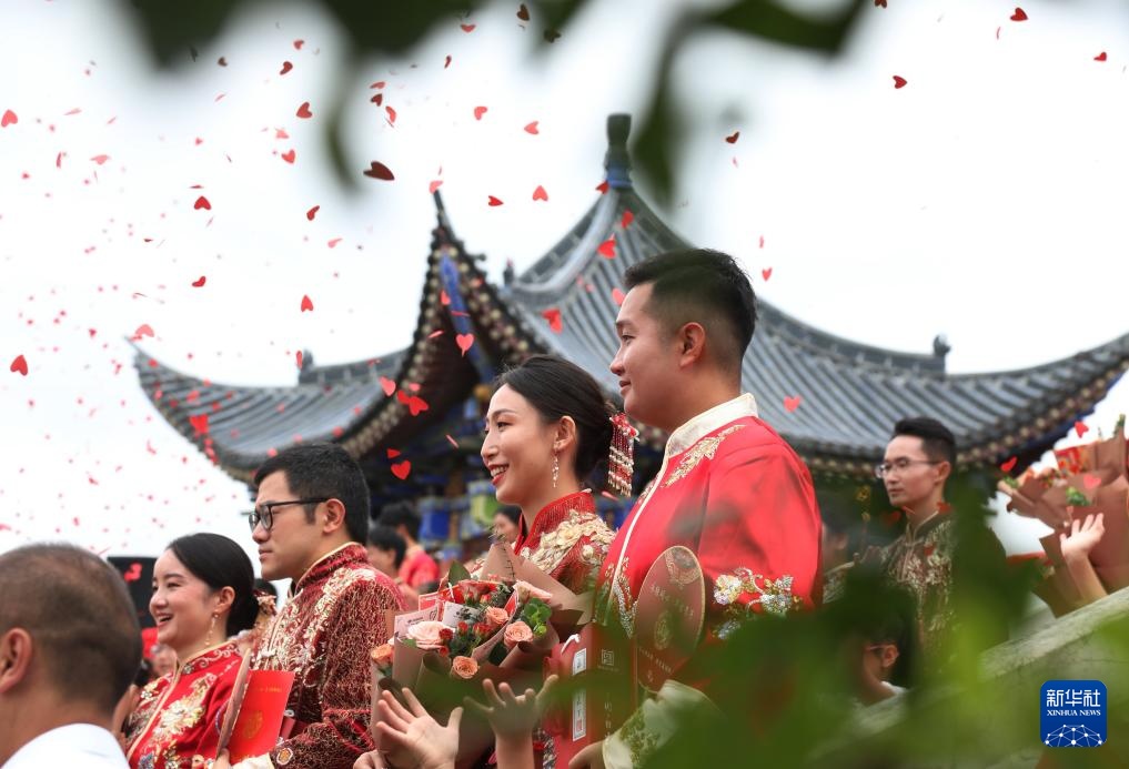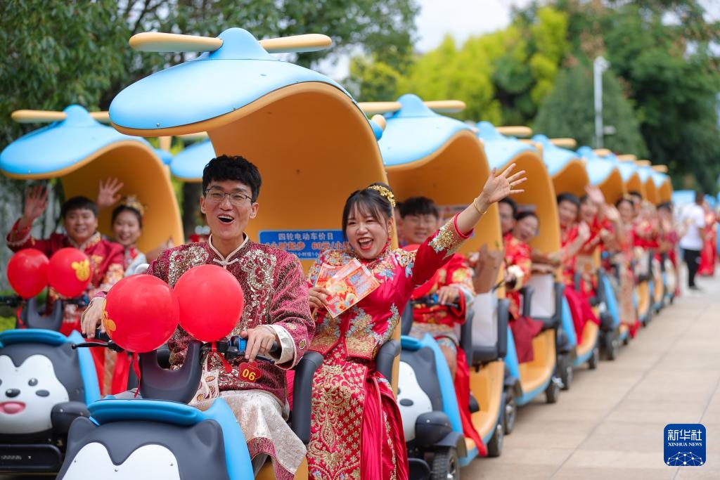 8月10日,在云南省保山市,新人参加“爱在七彩云南·情定温润保山”集体婚礼活动。
