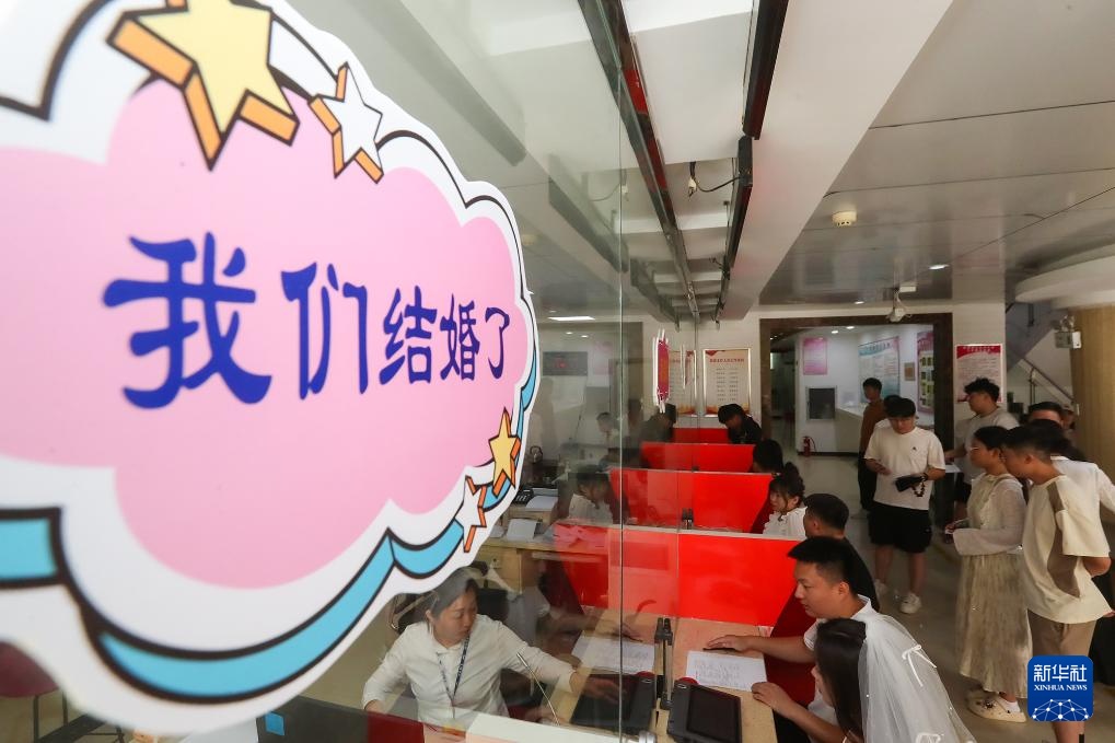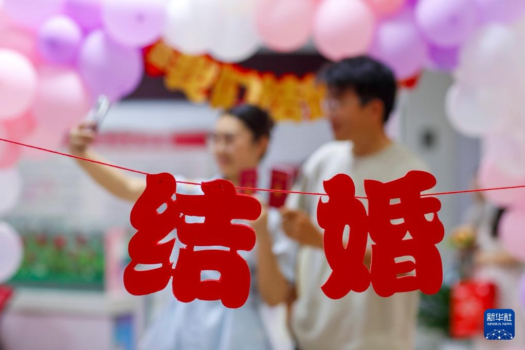 8月10日,在浙江省湖州市长兴县民政局婚姻登记处,新人办理结婚登记手续。