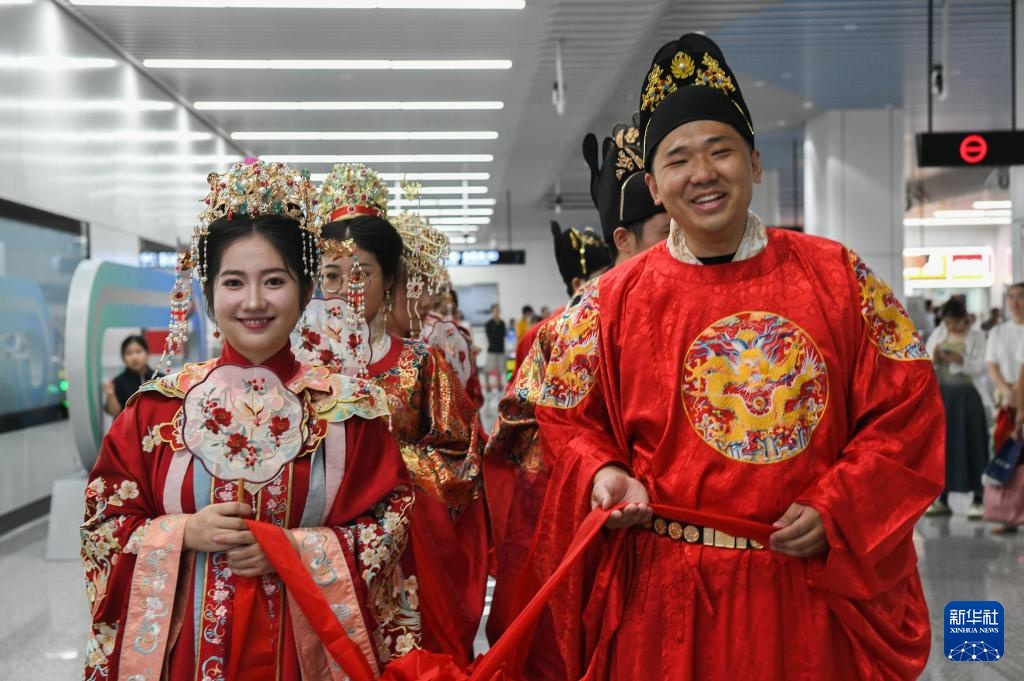 8月10日,在浙江省金华市金义东轨道交通金华南站,新人参加由浙江省金华市民政局与金华市轨道交通集团有限公司联合举办的“缘起金轨、爱在七夕”集体婚礼。