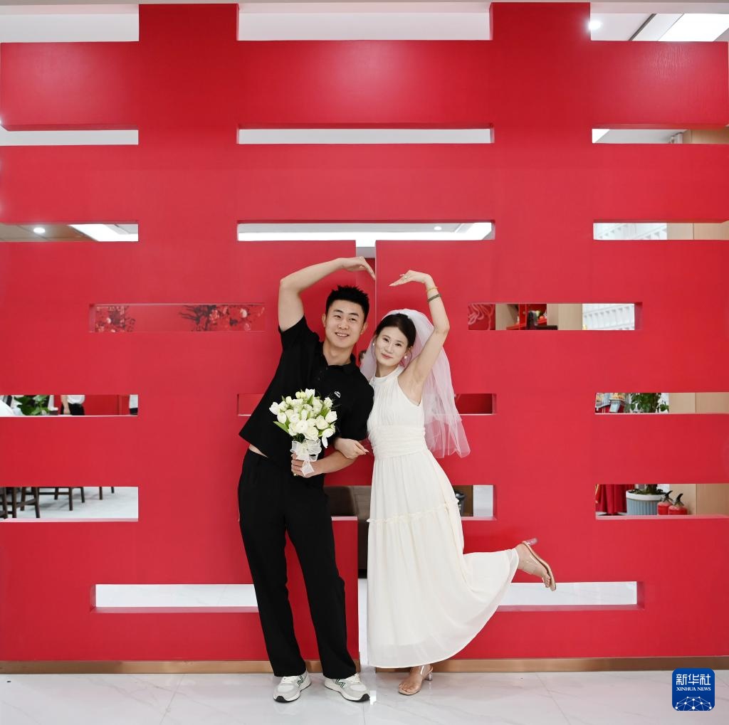 8月10日,在河北省石家庄市栾城区民政局婚姻登记处,一对新人登记后拍照留念。
