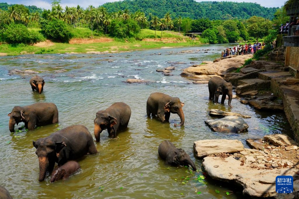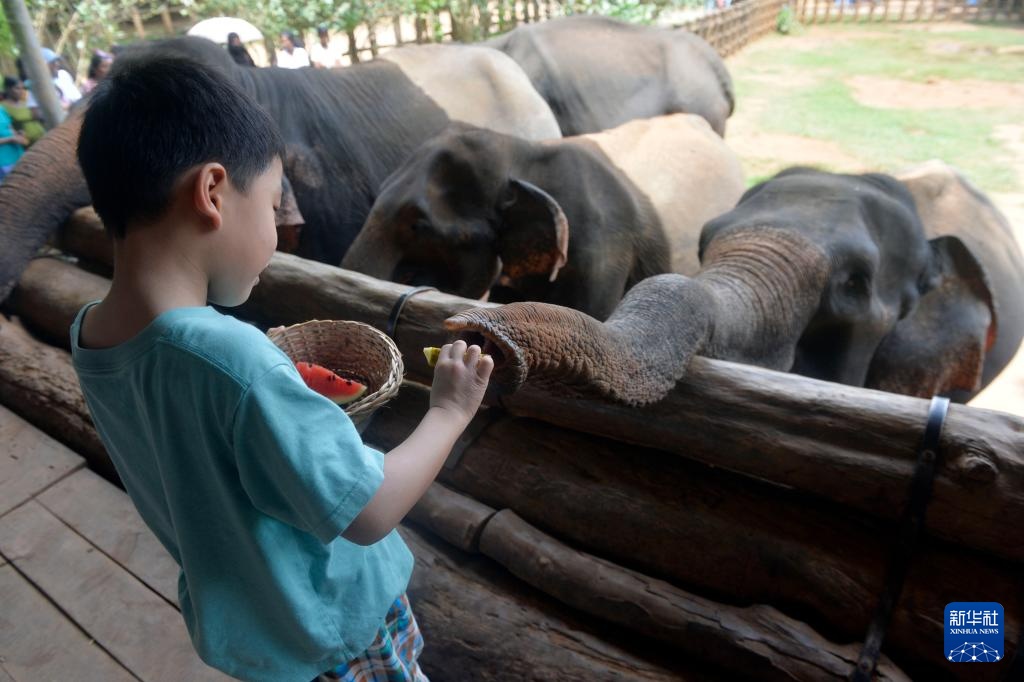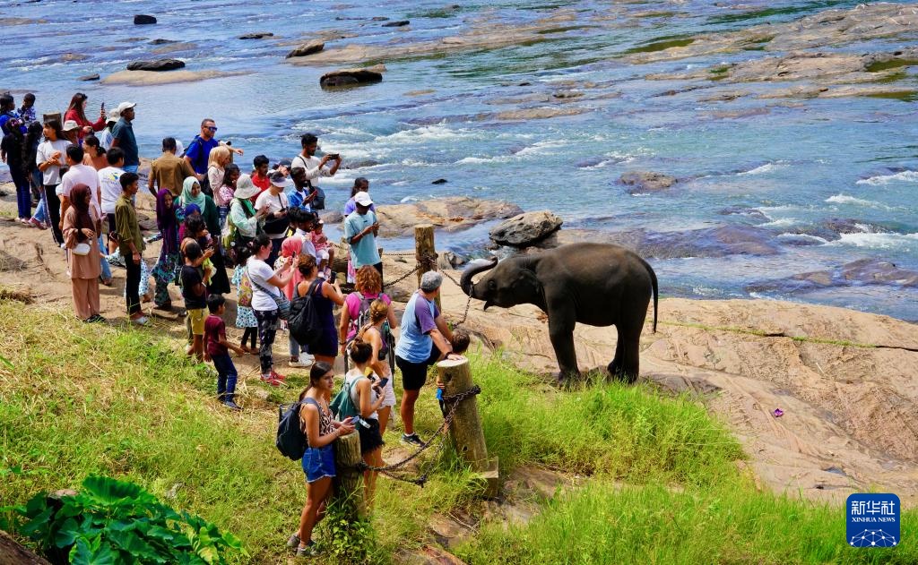 8月10日,游客在斯里兰卡平纳维拉大象孤儿院同大象互动。