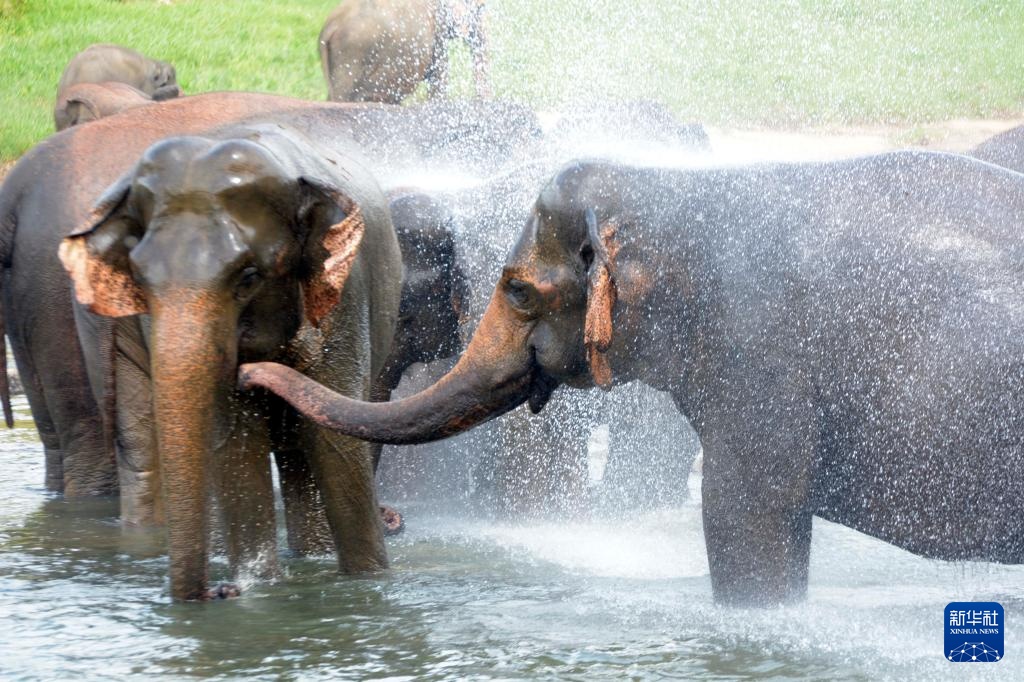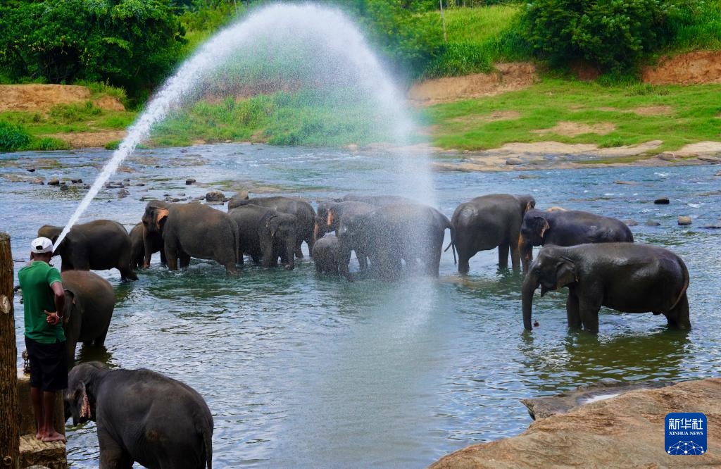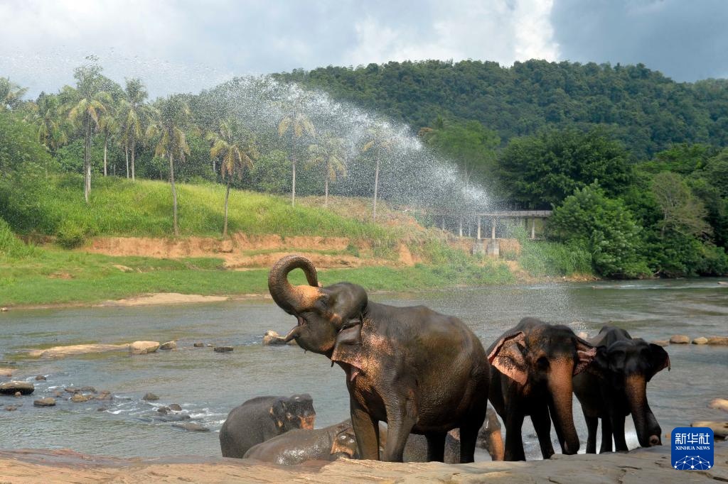 8月10日,大象在斯里兰卡平纳维拉大象孤儿院旁的河中洗澡。