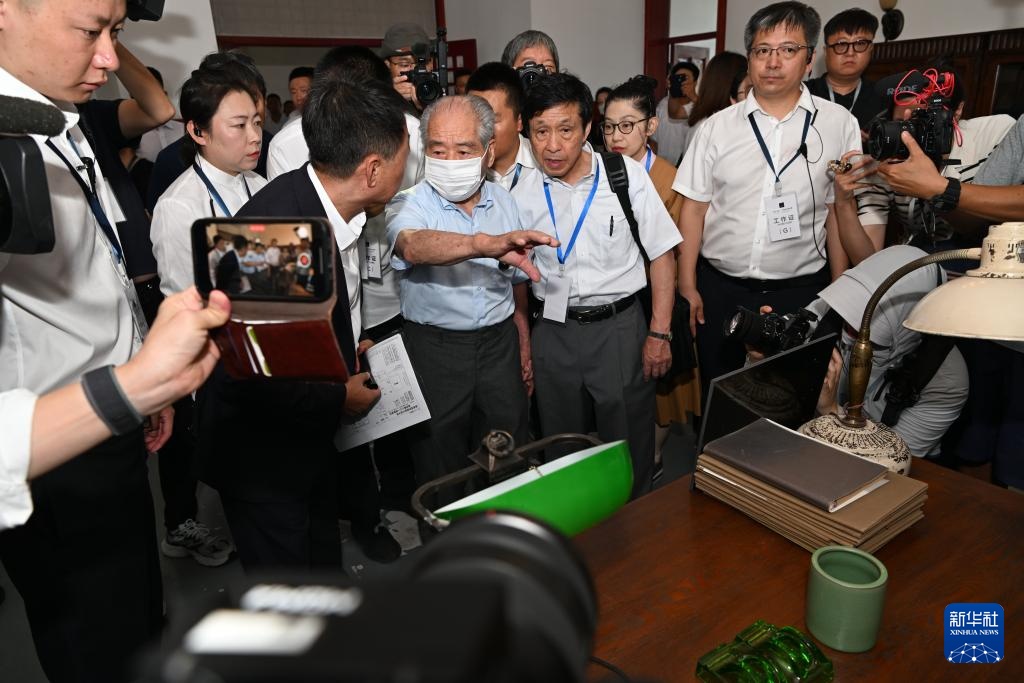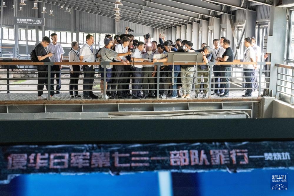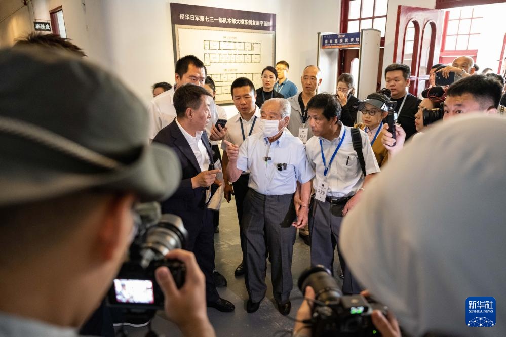 8月13日,侵华日军第七三一部队“少年队”原队员清水英男(右二)在侵华日军第七三一部队旧址内拍照。