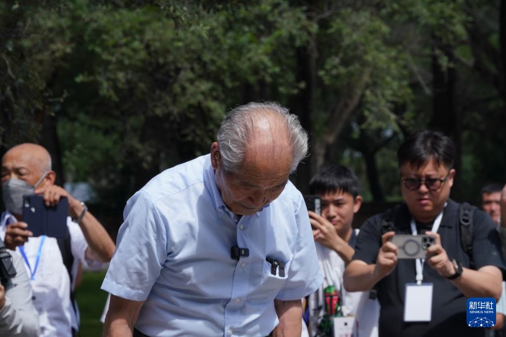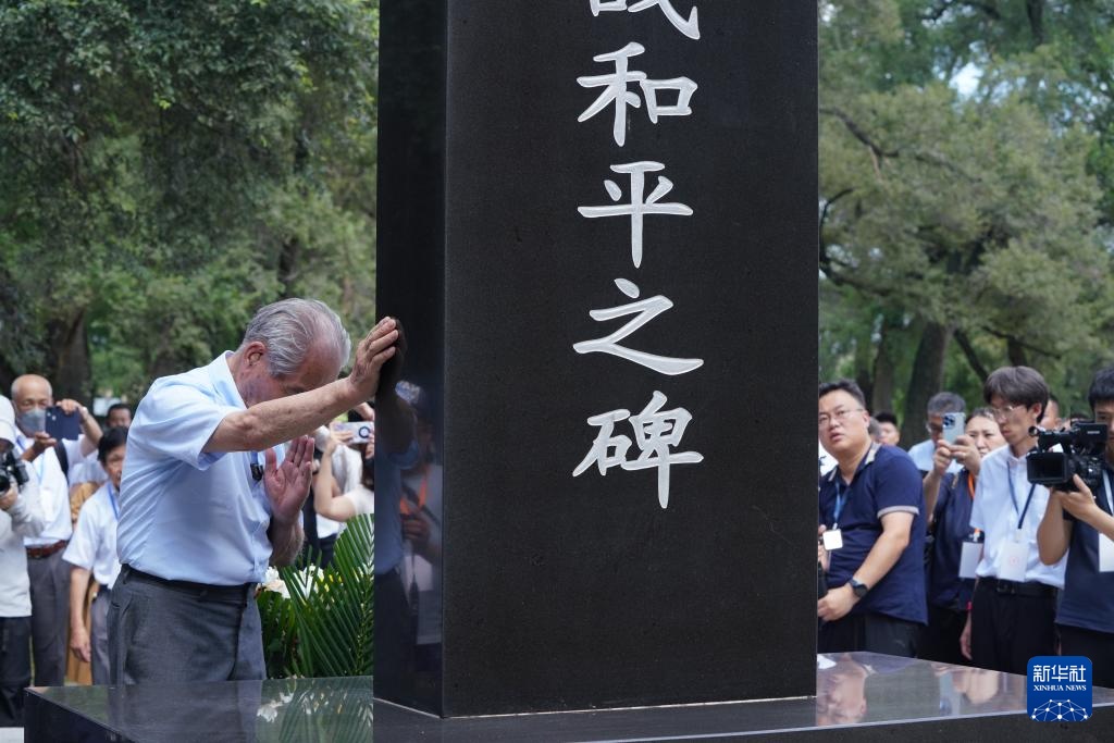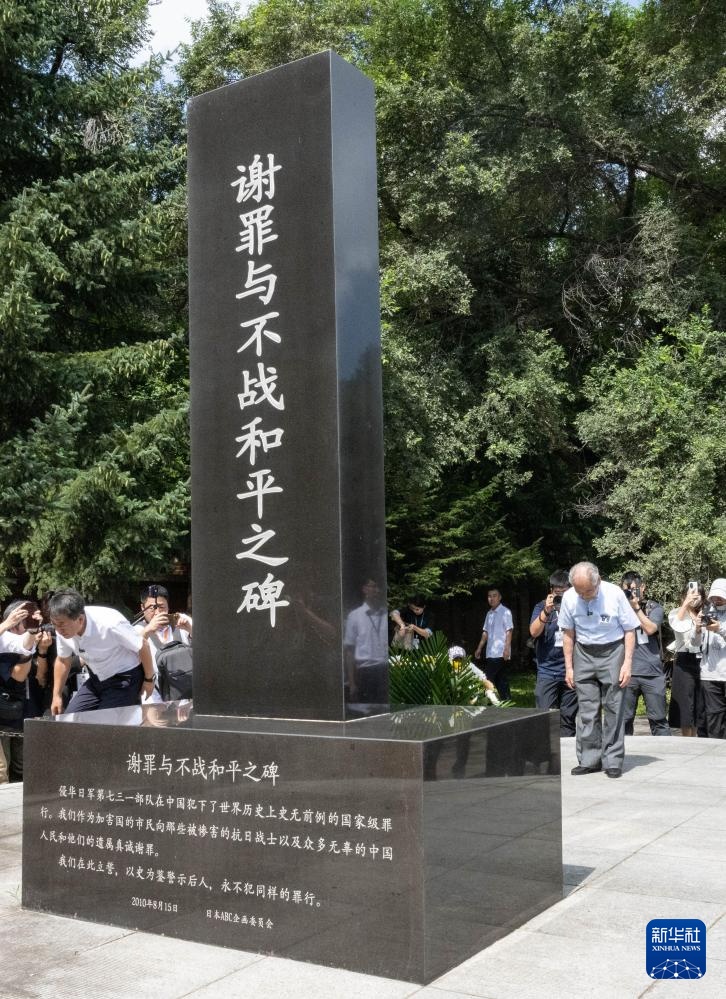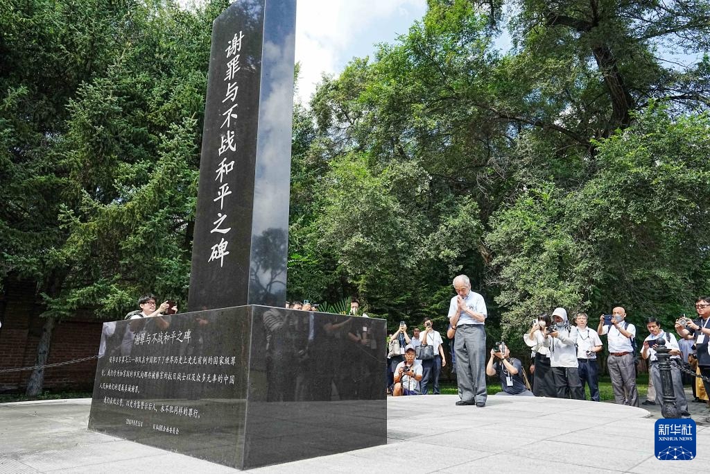 8月13日,侵华日军第七三一部队“少年队”原队员清水英男(左)在侵华日军第七三一部队旧址“谢罪与不战和平之碑”前忏悔谢罪。