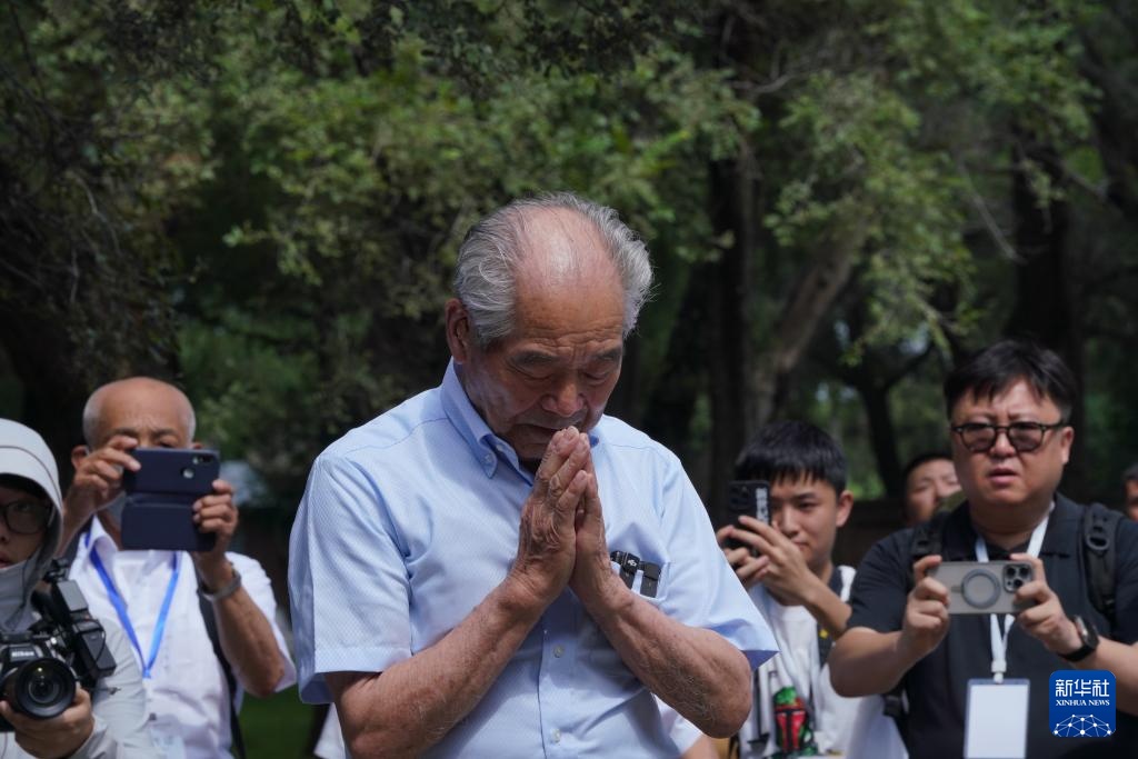 8月13日,侵华日军第七三一部队“少年队”原队员清水英男(前左二)在侵华日军第七三一部队旧址指认侵华日军细菌战罪行时双手合十。