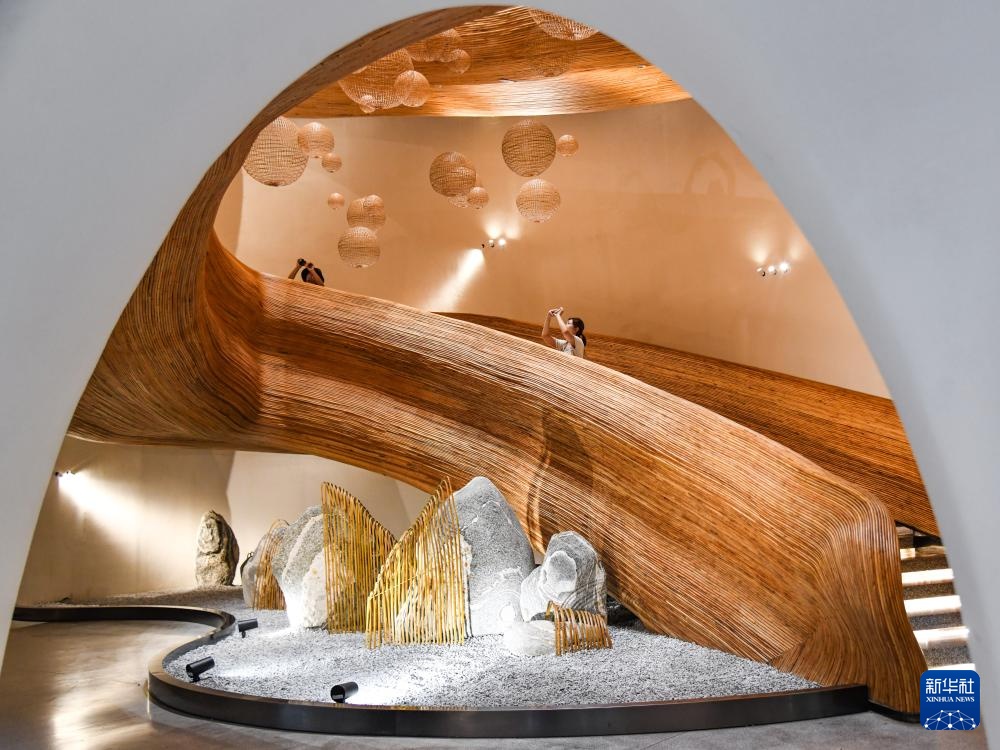 8月12日,在四川省崇州市竹艺公园,游客在竹艺术装置上拍照打卡。