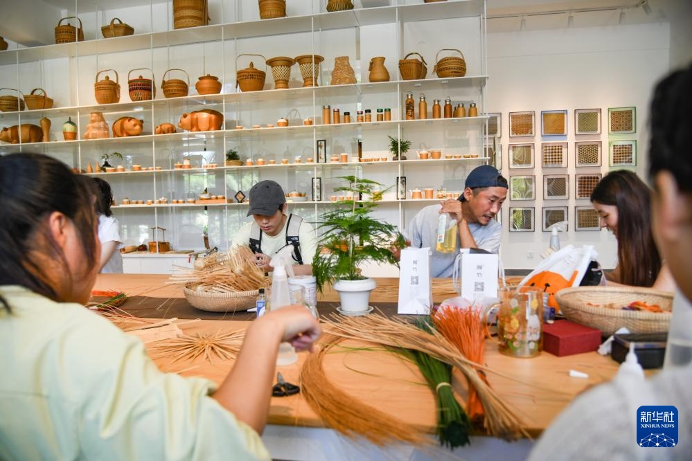 8月12日,在四川省崇州市竹艺村,游客在体验非遗竹编技艺。
