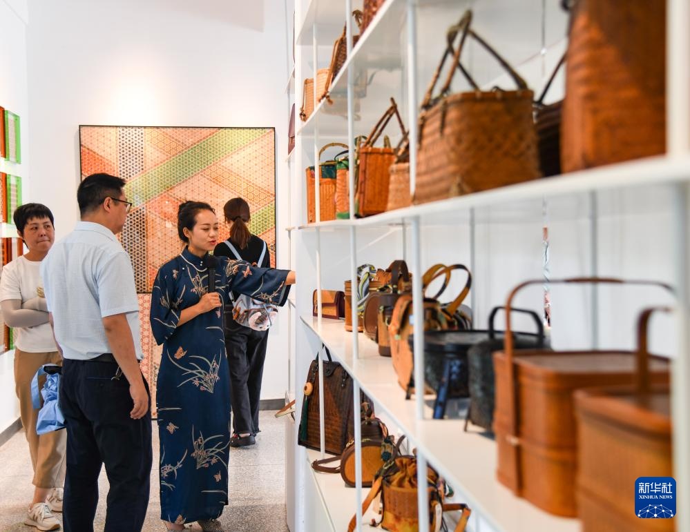 8月12日,在四川省崇州市竹艺村,道明竹编传承人杨隆梅(右二)在向游客介绍产品中使用的非遗技艺。