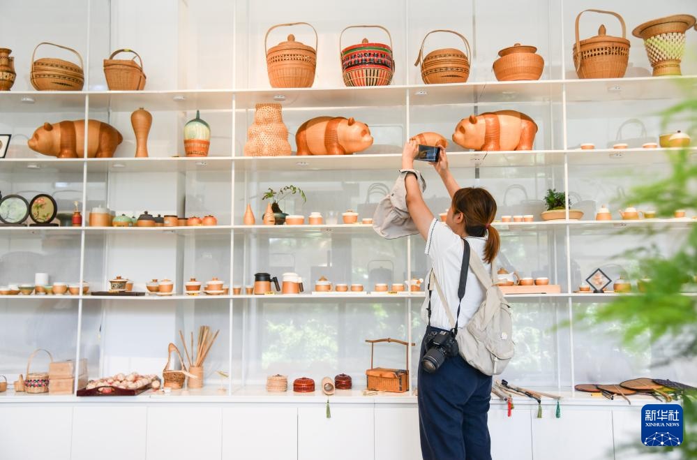 8月12日,在四川省崇州市竹艺村,游客在选购竹编产品。