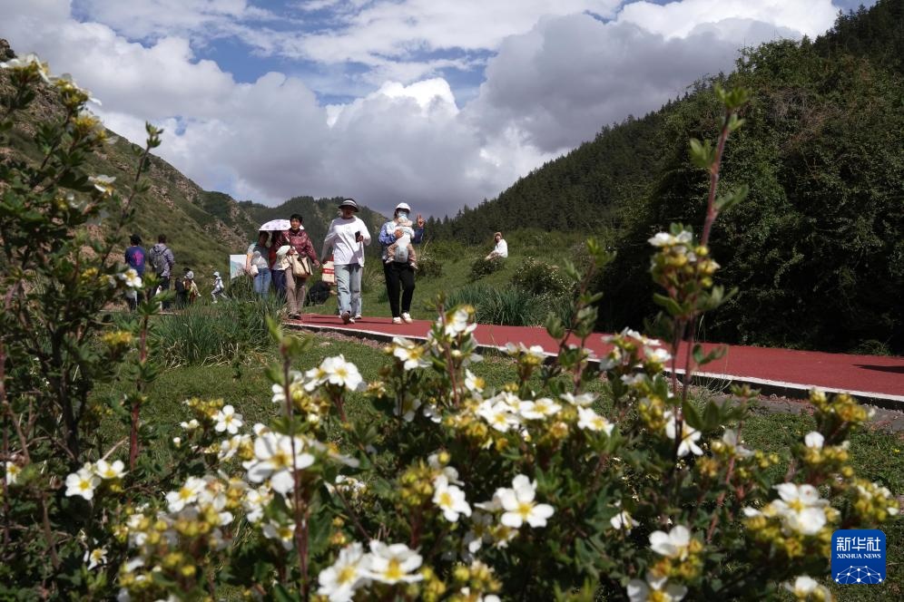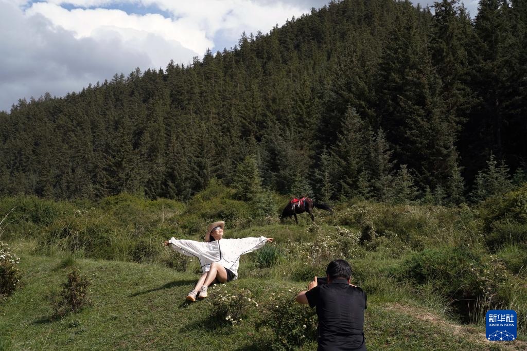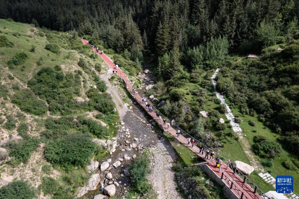 7月11日,游客在焉支山瑶池赏景游玩。