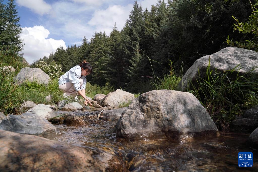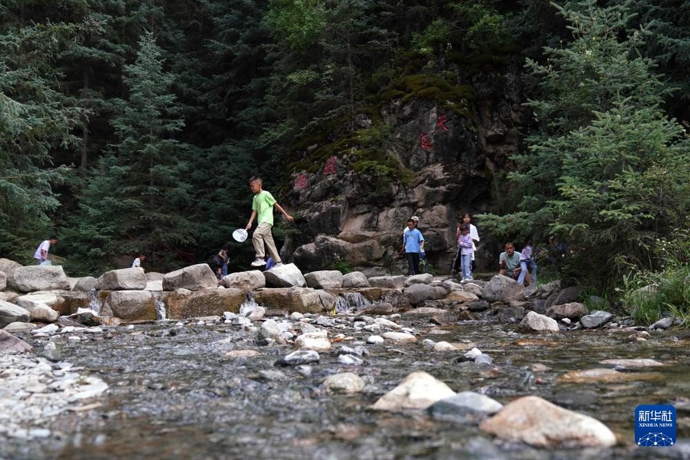 7月11日,游客在焉支山中的溪流旁戏水。
