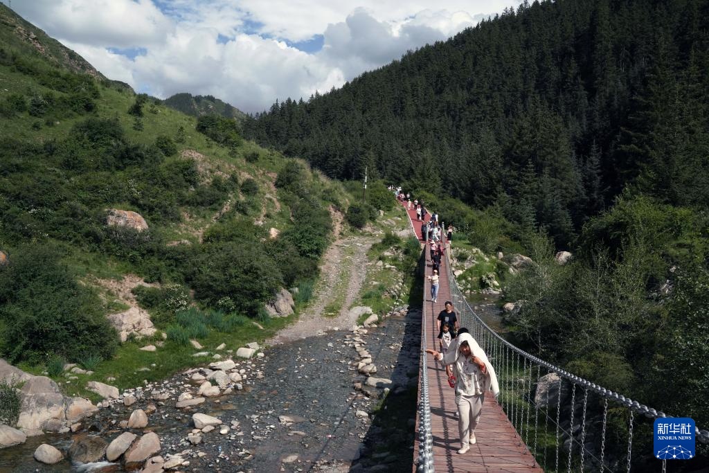 7月11日,游客在焉支山一处吊桥上赏景游玩。