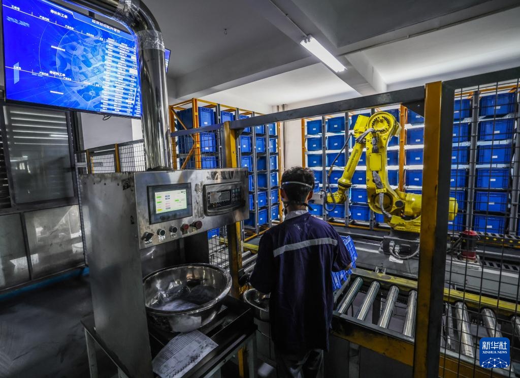 8月14日,在金华市金东区江东镇的浙江超浪新材料有限公司数字化车间,人机协同配料系统正在运行。