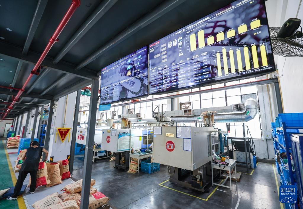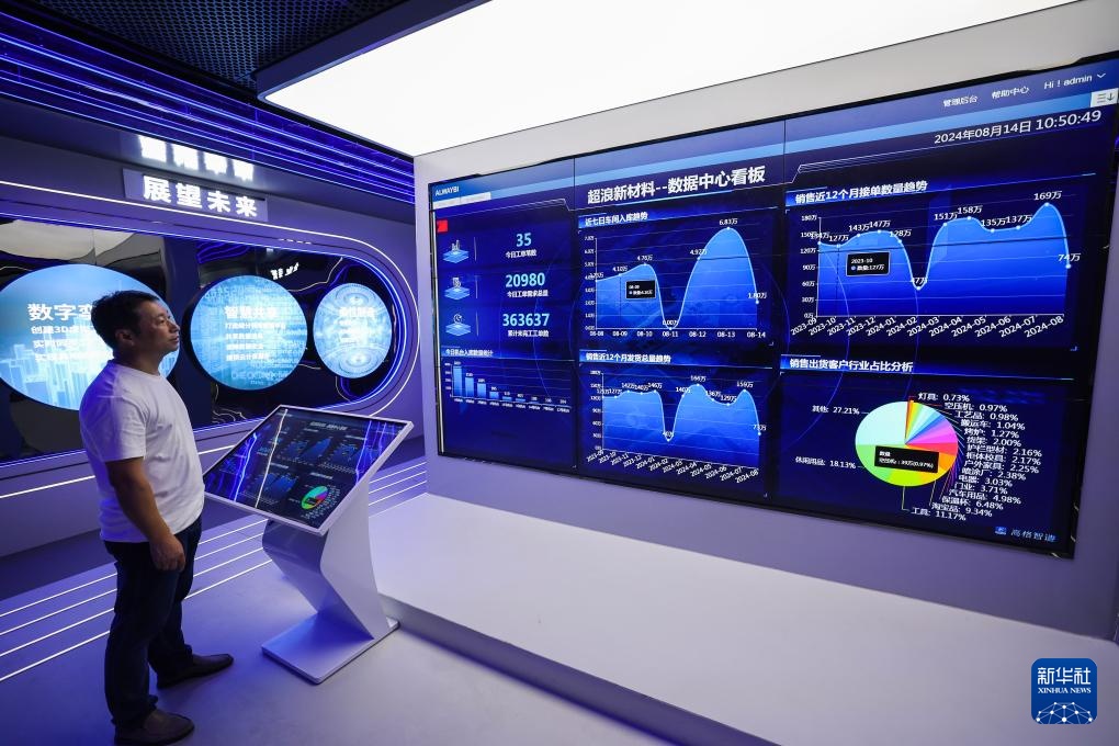 8月14日,在金华市金东区江东镇的浙江超浪新材料有限公司内,数据中心看板实时显示企业流水线的各项生产数据。